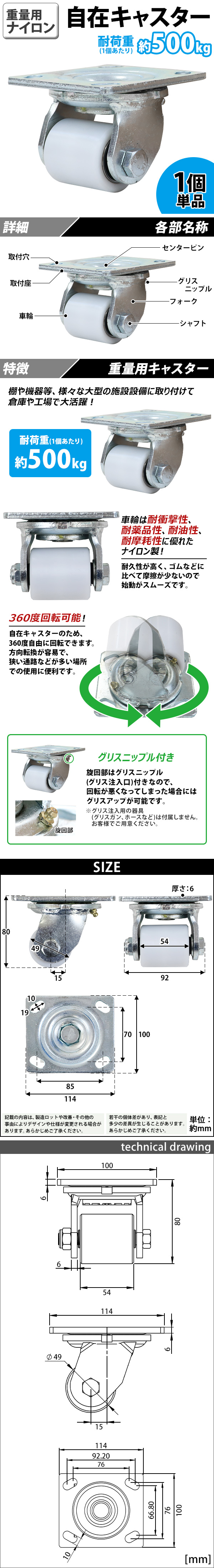 商品名 | 送料無料 キャスター 自在キャスター 重量用 ナイロン製 1個 単品 重量用キャスター 耐荷重約500kg(1個あたり) 車輪直径約49mm 幅約54mm グリスニップル付き 自在車 ナイロン車輪 工場 倉庫 作業 運搬 cstrnyfrn501p |