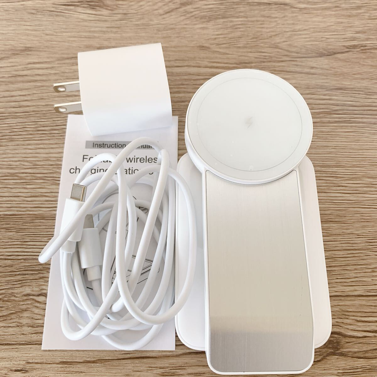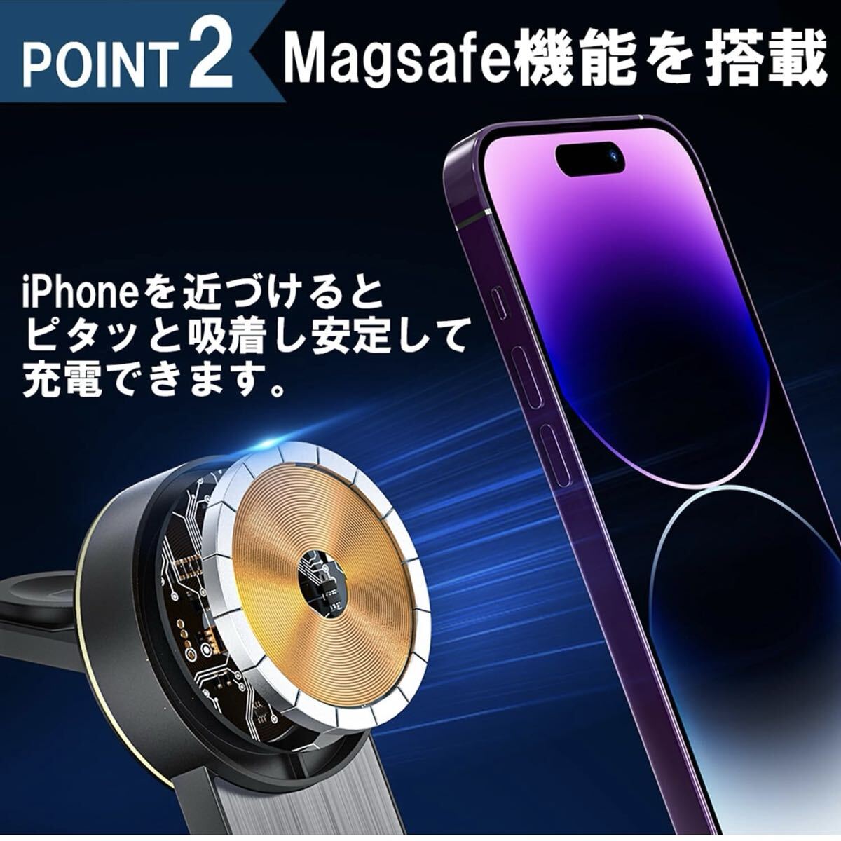 [3台同時充電可能] 1つの充電器でIPhoneまたはMagsafe対応スマートフォン、Apple Watch、ワイヤレス充電対応のAir Podsの3つを同時に充電可能です。※IPhoneやスマートフォンは、Magsafe対応機種かマグネット式ケースが装着されている場合に利用できます。