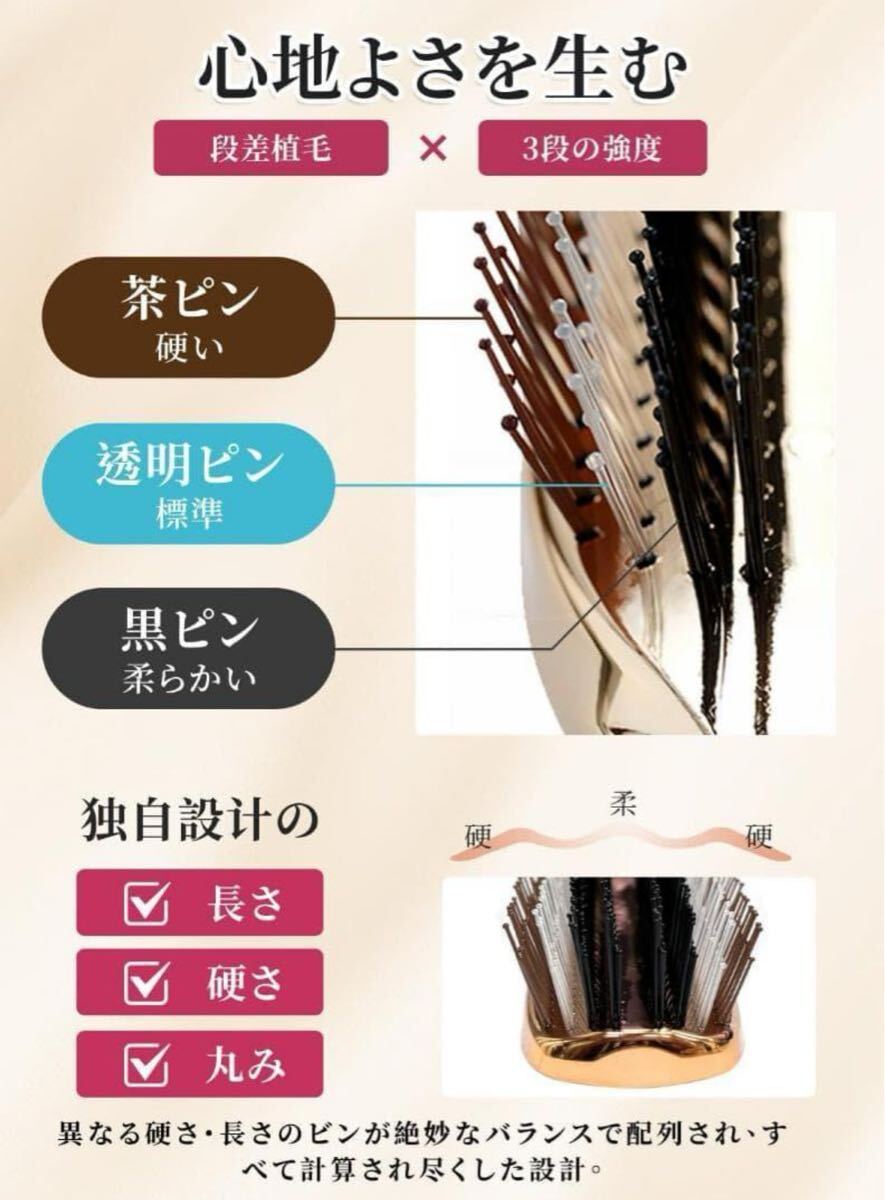 ヘアブラシは先端ボール加工と段差植毛が、頭皮の皮脂を汚れをかき出す、毛穴クレンジングを促進。長短のビンが髪を根元からふんわり立ち上げ、やわらかい仕上がりに。 髪の毛にハリやツャも与えてくれます。3種類の歯形状を8列に配置した計572本の特殊設計で、血行促進効果で、髪量が多い方の「頭の重だるさ」を軽減します。