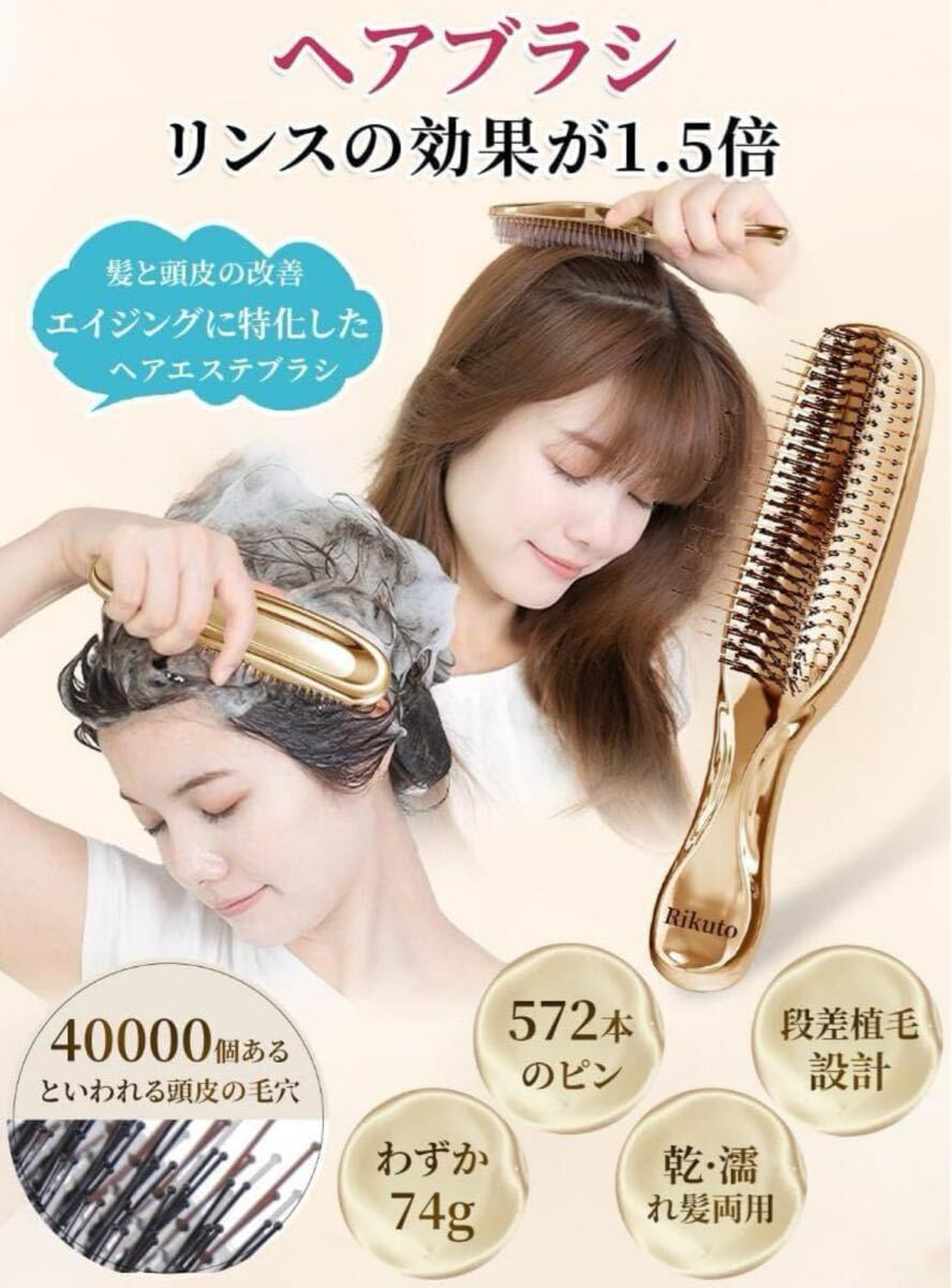 頭皮を傷つけないように限りなく真球に近いピンが,約 4万個あるといわれる頭皮の毛穴をクレンジング 。指では落とせない汚れをやさしく、しっかり落とします。髪がサラサラになるヘアブラシは指洗いに比ベて二才イを52%も減。スカルプブラシは従来梳き比べリンス成分の浸透率が1.5倍向上(※自社試験結果)。特に傷みやすい毛先までしっかりケア。