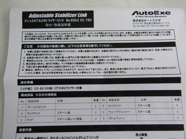 【 車名 】 CX-60 【 型式 】 KH3R3P/KH3P/KH5S3P/KH5P 【 備考 】 リアスタビライザー装着車 専用 【 取付位置 】 リア 【 品番 (商品コード) 】 KHA2-V5-760 ■特長・・・ ローダウン時のスタビライザーに欠かせない調整式リンク。 左右のサスペンションアームを結合し、そのバネ効果でロールを抑制するのが、ご存知スタビライザー。そのスタビライザーとサスペンションアーム(もしくはダンパー)を結ぶパーツが“スタビライザーリンク”である。量産車のスタビライザーエンド部のリンクの長さは、量産車高を基準に設計されているため、ロアアームの角度が変化する車高ダウン時には、スタビライザー本体とスタビライザーリンクのアーム角が適正値より鋭角となり、本来のスタビライザー効果をスポイルしてしまう傾向にある。アジャスタブル(調整式)スタビライザーリンクはリンク長さを調整することで、アーム角を適正化し、スタビライザー本来の機能を復活させるアイテム。シュアなハンドリングに徹底してこだわりたいユーザーのリクエストに応えるべく、幅広い車種でのラインナップを展開している。ローダウンスプリング装着時の同時装着を推奨する。 ![]() |