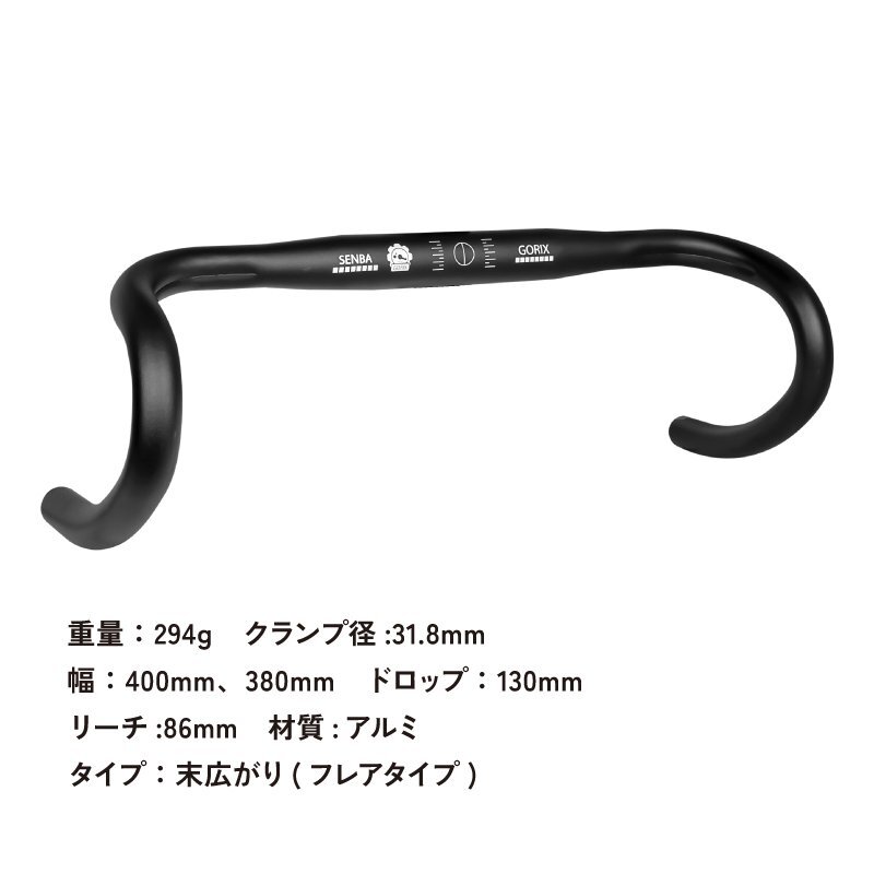 | 下ハンドルが広がっているのが特徴のフレアハンドル。 ショートリーチでブラケットが握りやすいタイプ。 エンド部分に向けて末広がり。 ロードバイクの他にもオフロード走行を目的としたシクロクロスやグラベルロード、ツーリング車等におすすめ。 [フレア形状] 下ハンドルが広がっているのが特徴のフレアバー。 (エンド部分に向けて末広がり) 上ハンドルを狭く、下ハンドルを広くする事でポジションを柔軟に変更できます。 [ショートリーチ] ショートリーチでブラケットが握りやすい。 手の小さい方やブラケットを近くした方にもおすすめです。 [耐久性] 軽量で丈夫なアルミ材質 [センターライン] ハンドル交換の際に調整しやすいセンターラインとメモリ 商品内容ドロップハンドル 幅380mm クランプ径31.8mm 重量294g ※400mm ドロップ130mm リーチ86mm 材質アルミ タイプ末広がり(フレアタイプ) | |