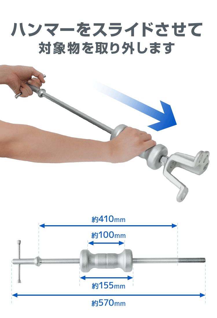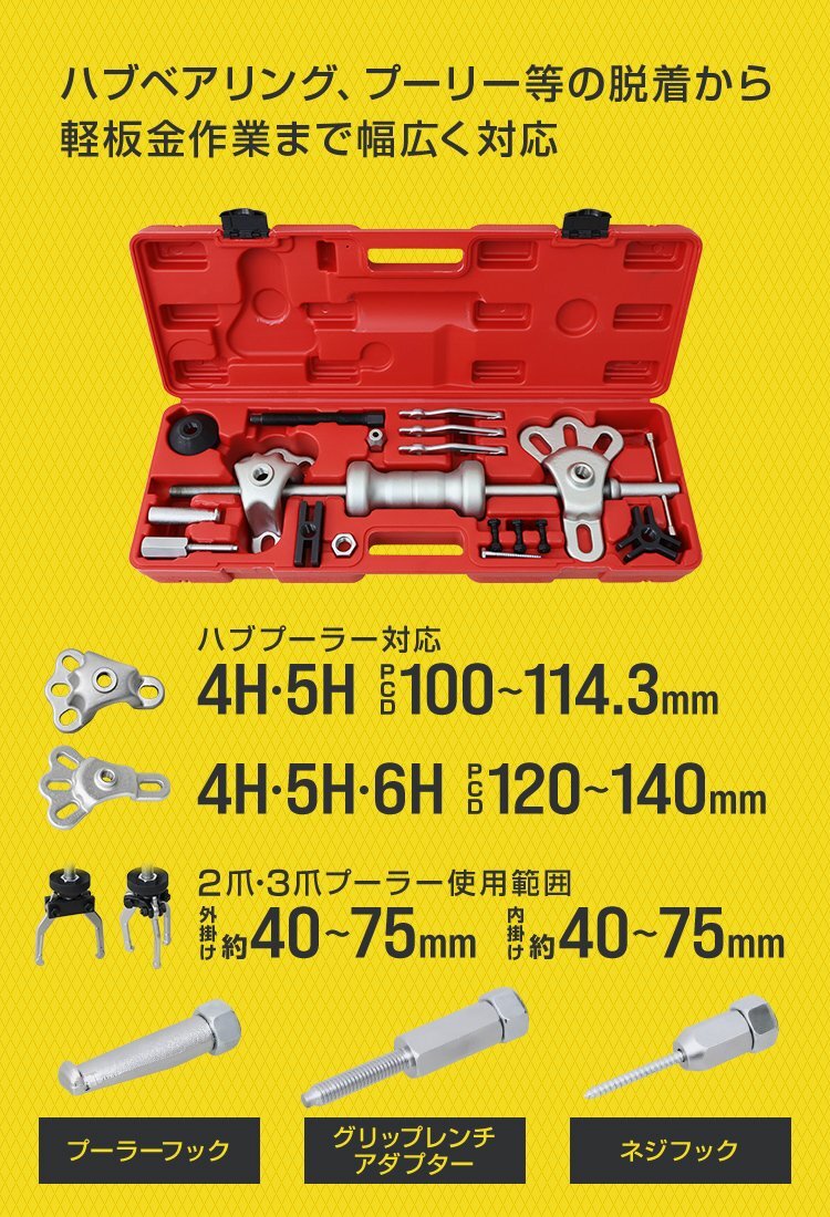 引っ張り作業に重宝! ドライブラインの修理・交換や板金作業に欠かせない工具です。 車、バイクの整備、タイヤ交換などに! 大きなハンマーでとっても強力!! シャフトやベアリングはもちろん、プーリーやベアリング等の取り外しも簡単に行えます。 7種類のアタッチメントがセットされていますので、幅広い用途に対応しています。 また、4穴&5穴兼用のハブプーラーも付いています。 これあると、FF車のフロントハブやFR車のリヤシャフト、ブーツ、ベアリングなどを抜き取ることができます。 ■商品詳細 サイズ:スライディングハンマーの先端のネジ径:5/8" ピッチ:18tpi 重量:8.0kg ■商品内容 ハンマー(2.2kg) シャフト(560mm) Bigプーラー グリップレンチアダプター 2爪フックヘッド 3爪フックヘッド レッグセット 3ピースフック Smallプーラー センターボルト ●写真と実物は多少異なる場合がございます。あらかじめご了承下さい。 ●もちろん新品未使用品です |