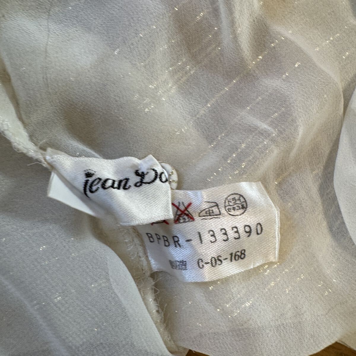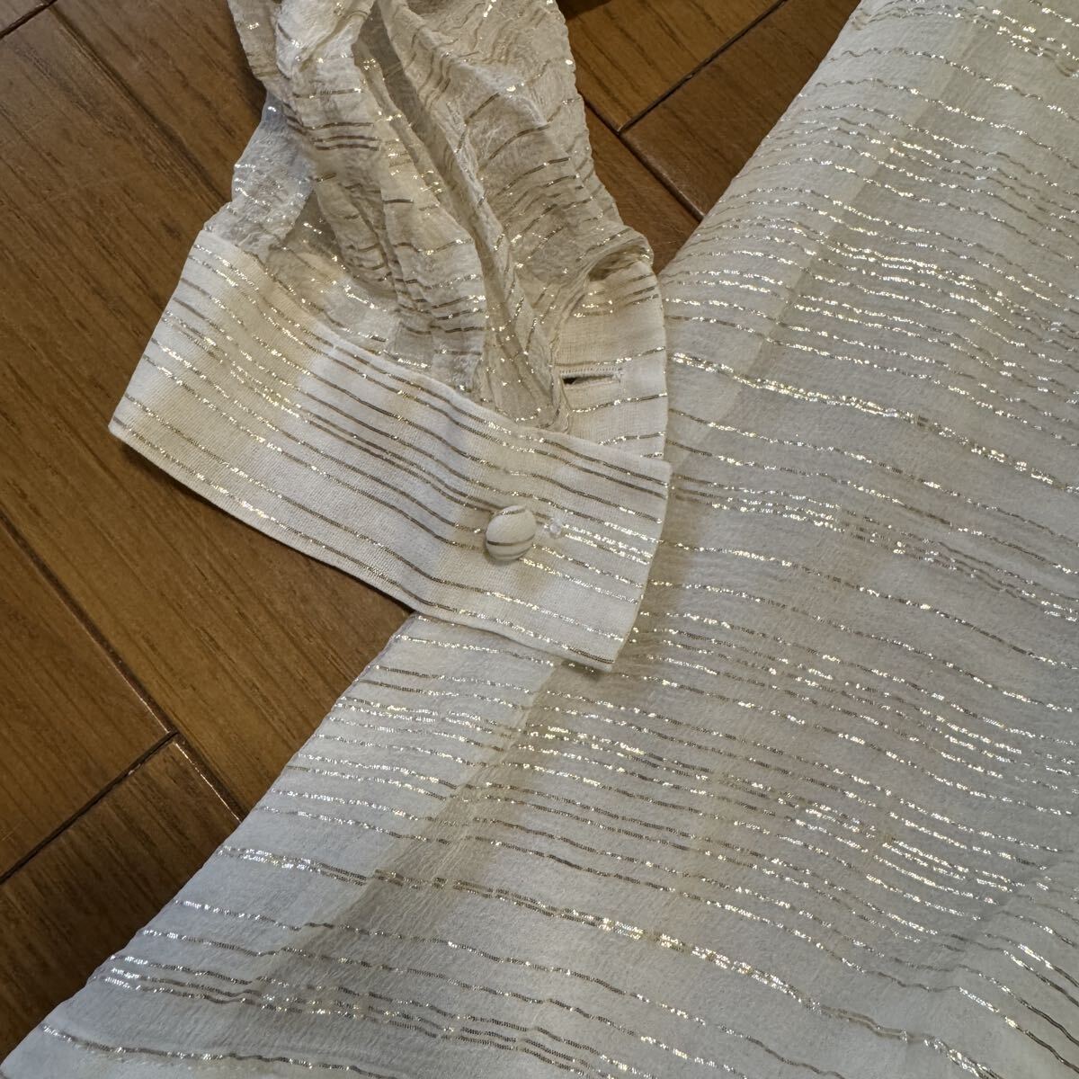 JeanDorePalaisジャンドールパレのフリルブラウスです。アイボリー地にゴールドラメ糸のストライプ柄、襟元から胸にかけて施され他フリルがきれいです。家族が所有しておりましたが、衣類の整理が必要となりましたためお譲り先を探しています。着用2・3回で目立った汚れ・傷みはありませんが、ヴィンテージ品ですので細かい点が気になる方はご遠慮ください。