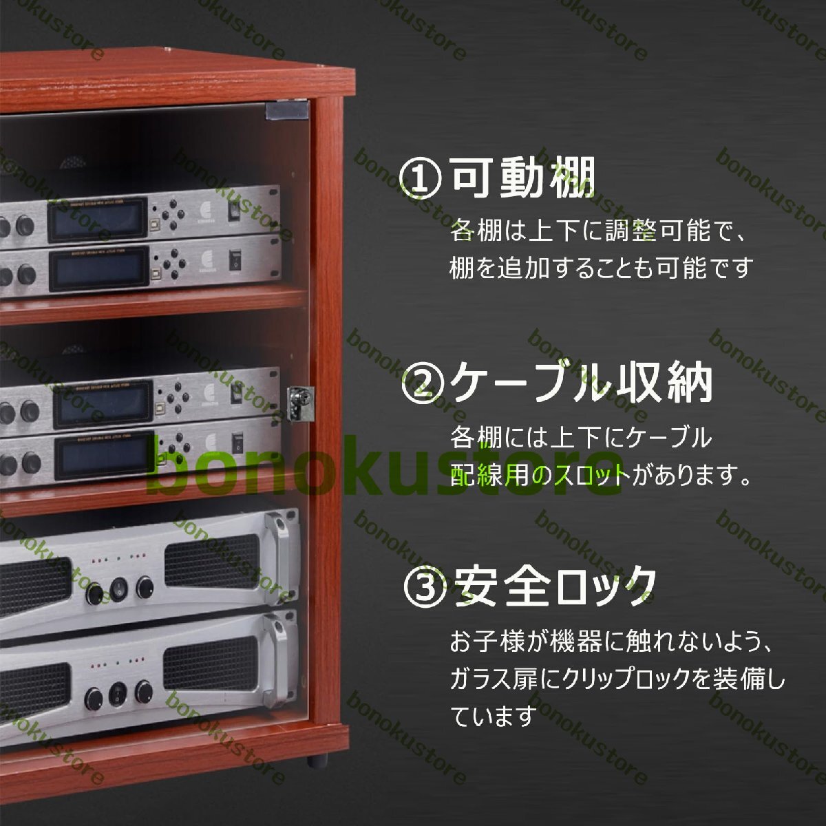 オーディオラック 木製 防爆強化ガラス扉付き 可調節棚板 安全ロック 背面通気孔 アンプラック AV機器収納 CD dvd アンプ メディアスタンド ホームシアターキャビネット 音工房 録音室用 家庭用 オフィス用 チーク色 55*50*107cm