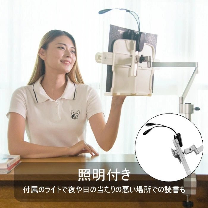 【ベッドやソファで快適読書】両手を使わずにベッドで読書が可能です。サイドテーブル等にアームスタンドを固定してご使用ください。ベッドに座った状態、横向き、仰向けになっても快適に読書が楽しめます。就寝時はアームを折りたたんでください。