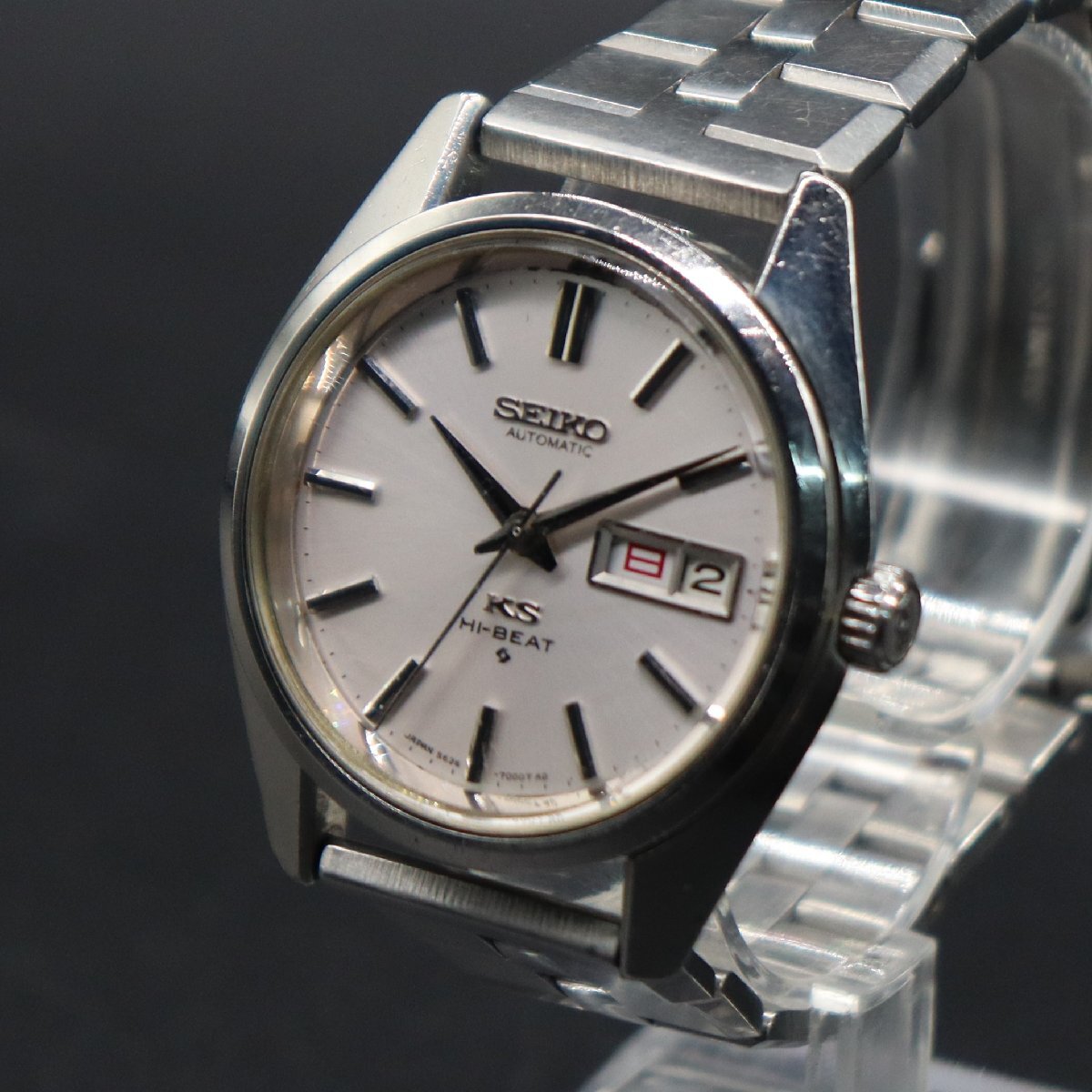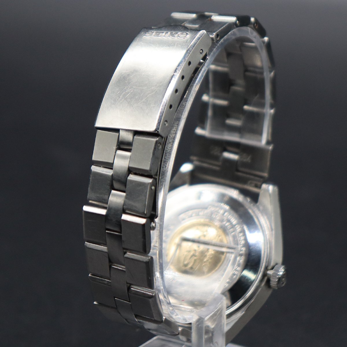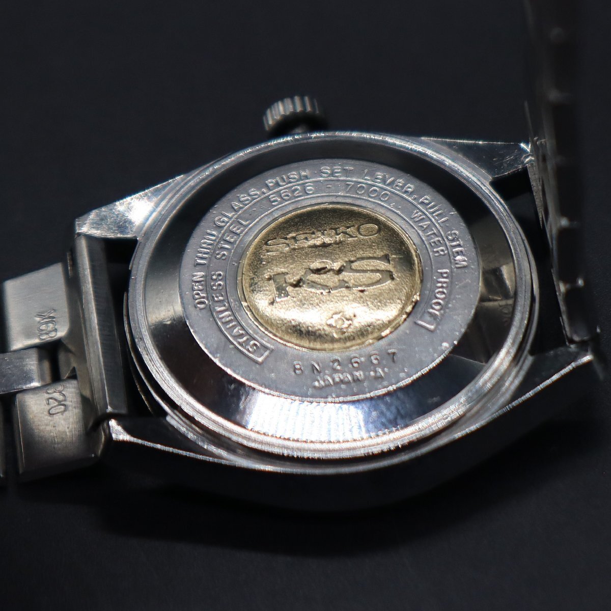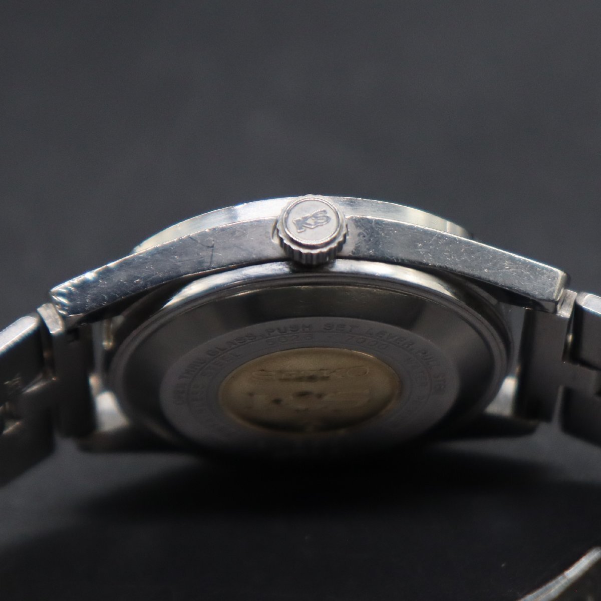平置きで12時間動作確認済み、大幅な遅れなく稼働中です。 リューズ一段引きで、デイデイトクイックチェンジOK、 二段引きで時刻調整が可能です。 ※カレンダー早送り機能は、商品同封の使用上の注意を必ず守り、 丁寧に、やさしく操作していただくようお願いいたします。 こちらのモデルは56KSの初期モデルで、 メダリオンがはめ込まれたワンピースケースになります。 全体に経年のキズ、ラグ足に小打痕、ガラスに複数のキズと フチに小さなカケ、文字盤と針に小傷みございますが、 インデックスや植字ロゴは傷み少なく、視認性は十分保たれております。 プリントロゴや印字は消えなく、良好です。 純正リューズ、KSマーク良好です。 裏蓋、傷みございますが、KSメダリオンございます。 周囲の刻印鮮明です。 ブレス、スレと小タレございますが、通常使用に問題ございません。 バックルの「SEIKO」ロゴ、開閉良好です。 アンティークですので、詳しくは画像にてご判断願います。 |