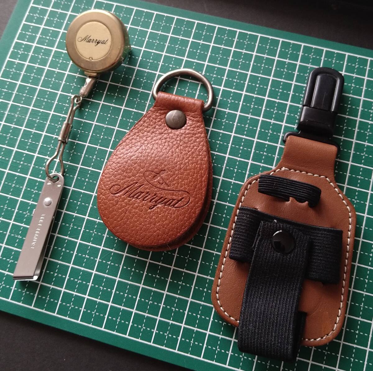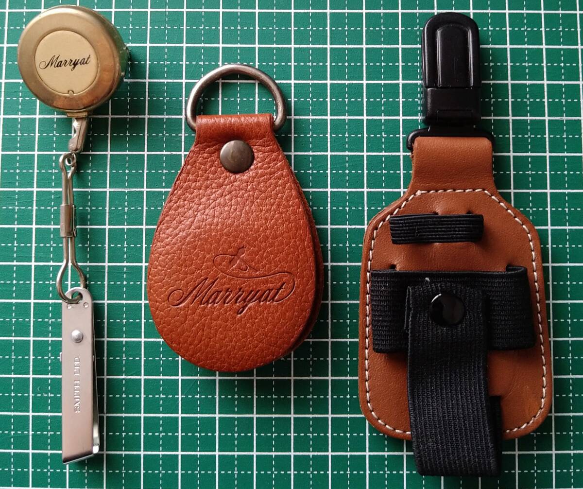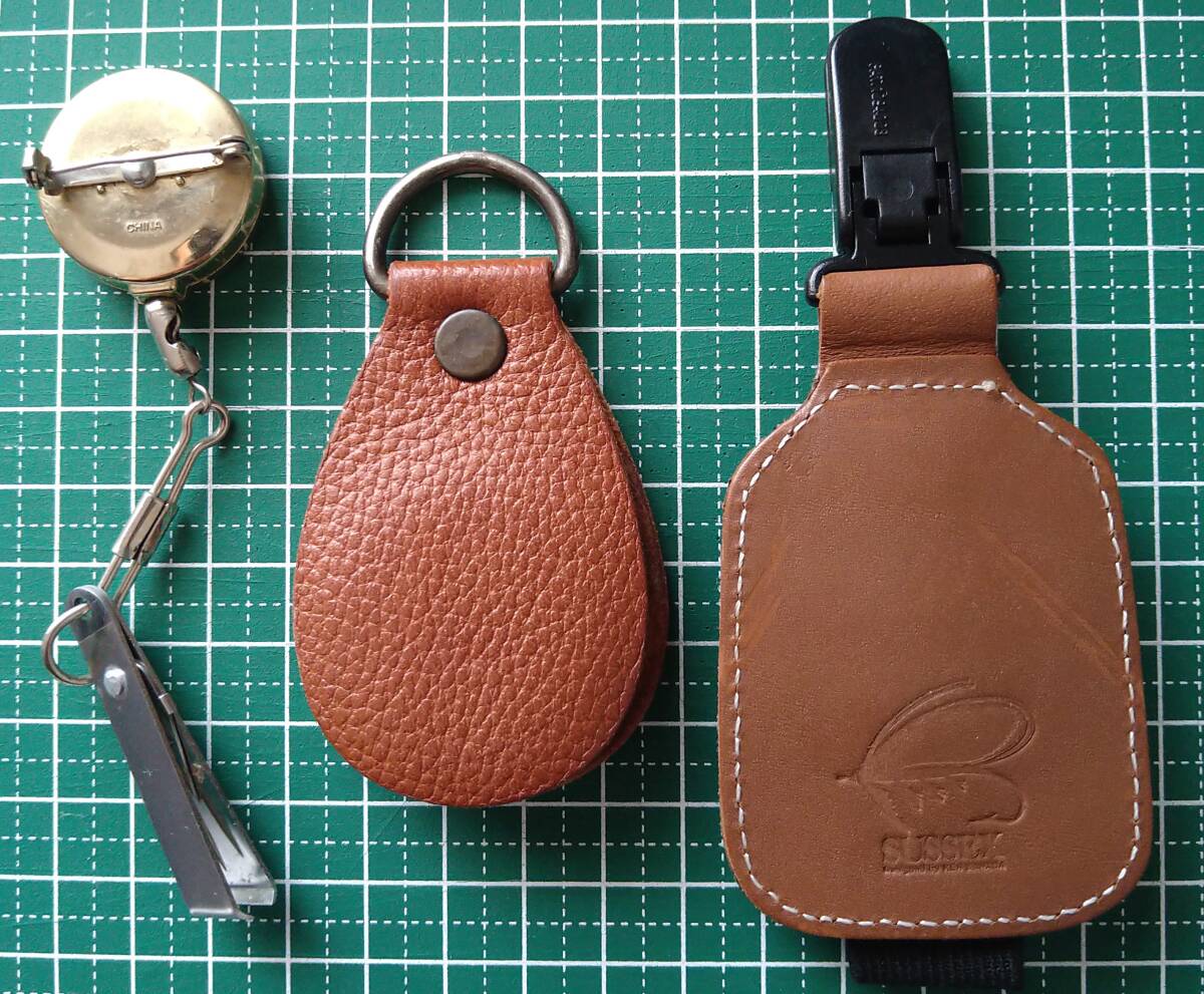 マリエット「ピンオンリール(ラインカッター付き)」「フライライン・クリーナー」、サセックス「ボトルホルダー」の【中古】です。(緑色のマットはサイズ確認用で商品には含まれませんので留意してください。)