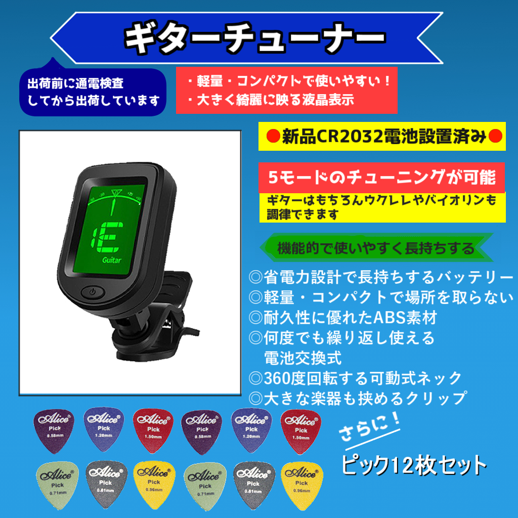 | 【商品について】 ■商品について ・クリップ式 デジタルチューナーと厚さ違い(0.58mm~1.50mm)のピック12枚セットです 【チューナーについて】 どこでも持ち運びしやすい手のひらサイズ。クリップが付いており、ギターの弦に挟んでチューニングできます。 ギター、ベース、バイオリン、ウクレレ、クロマチックのチューニングがプリセットされたクリップオンデジタルチューナー 2色のバックライト付き液晶画面には、選択した楽器、弦がチューニングされている音、そして弦がチューニングされているか、低いか、高いかを示すインチューンインジケーターメーターが表示されます。 弦がチューニングされている場合、メーターは中央に表示され、表示色は緑色に変わります。 弦がチューニングされていない場合、メーターは低音か高音かを示し、表示色は青色になります。 オートパワーオフ機能により、信号がない場合、または操作がない場合は、3分後に自動的に電源が切れ、長時間の電池寿命が得られます。規格のCR2032電池は家電店や100円ショップ等で入手できます。 付属品:CR2032電池、説明書(英語) 精度:±0.5音分 重量:約16.7g サイズ:約48*73*28(mm) 【ピックについて】 ■アリス ALICE abs製 ギター ピック プラスチック製のギターピックです。 ソフト、ミディアム、ハードすべて揃っております。 0.58mm~1.50mmまでの12枚セットとなります。 カラーはランダムに選ばさせていただきます。 こちらは海外直輸入製品となります。 お安くご提供するため元箱から取り出した状態で発送します。 ※チューナーの元箱は付属しません。 画像はイメージです。 ■発送について 定形外にて発送いたします。 アコースティックギター エレキギター ベース バイオリン 弦楽器 調律 ウクレレ フォークギター クラシックギター |