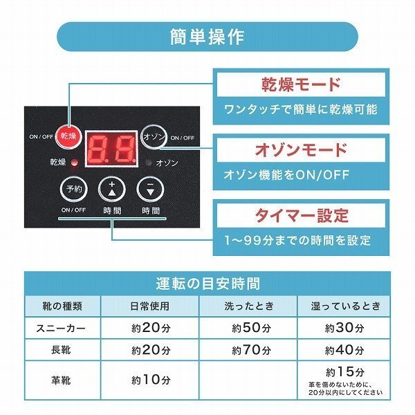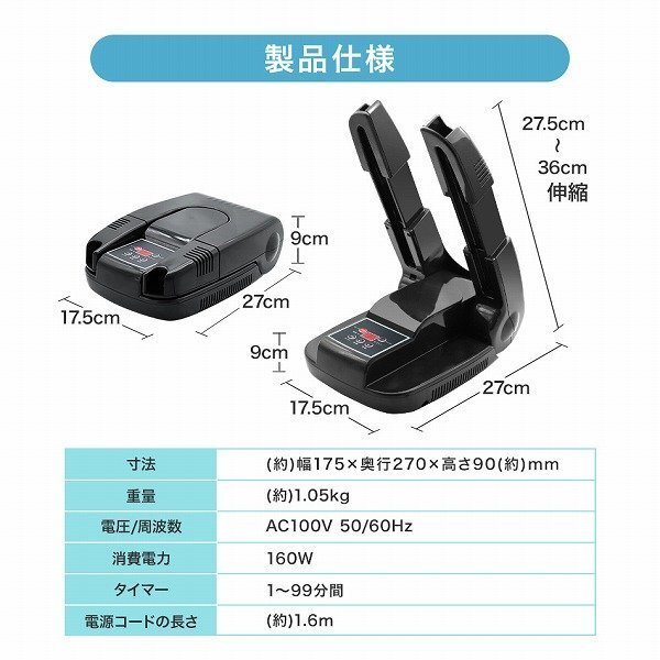 「足の裏から出る1日の汗の量」をご存じですか? 足の裏には1平方センチメートルあたり 約300 個も汗腺があり、 多い時には両足で1日に 200mlの汗を出しているそう。 皮膚の表面にある細菌が汗の水分で活発になり、 垢や皮膚の脂をエサにしてどんどん増え、臭いを出します。 靴を履いた後は除湿をしてあげないと、 劣化や取れないニオイのもとになることも…。 そんなあなたに、「消臭」・「除菌」・「乾燥」の 一台3役・靴乾燥機がオススメ! ニオイの原因である大量の雑菌と湿気をオゾンで除去。 乾きにくい梅雨の時期や、スポーツ・お仕事で汚れた靴をサッパリさせます♪ 靴専用の乾燥機なので、乾きにくいつま先まできちんと乾燥。 カビやニオイを防ぎます。 折りたたみ可能でコンパクトに収納可能♪ 1分~99分までののタイマー付きで、最長99分のタイマー設定可能です。 伸縮性がある二つのブラケットが付属しているので、 約27cmから36cmまでの距離が調整可能! 【現場仕事、外仕事の事業者様にも】 こんな時、現場で設置すれば大活躍☆ ・雨の日に靴の中が浸水してしまった ・暑い日に安全靴・長靴の内部が蒸れた ・冬場のゴム手袋内部の乾燥 温風が出るので、靴以外にもカッパを乾かしたり 冬場は防寒服を温めておくのにも使うのも◎ 【商品詳細】 サイズ(約):幅17.5cm×奥行27cm×高さ9cm 重さ(約):1.05kg 電圧/周波数:AC100V 50/60Hz 消費電力:160W コードの長さ(約):1.6m |
