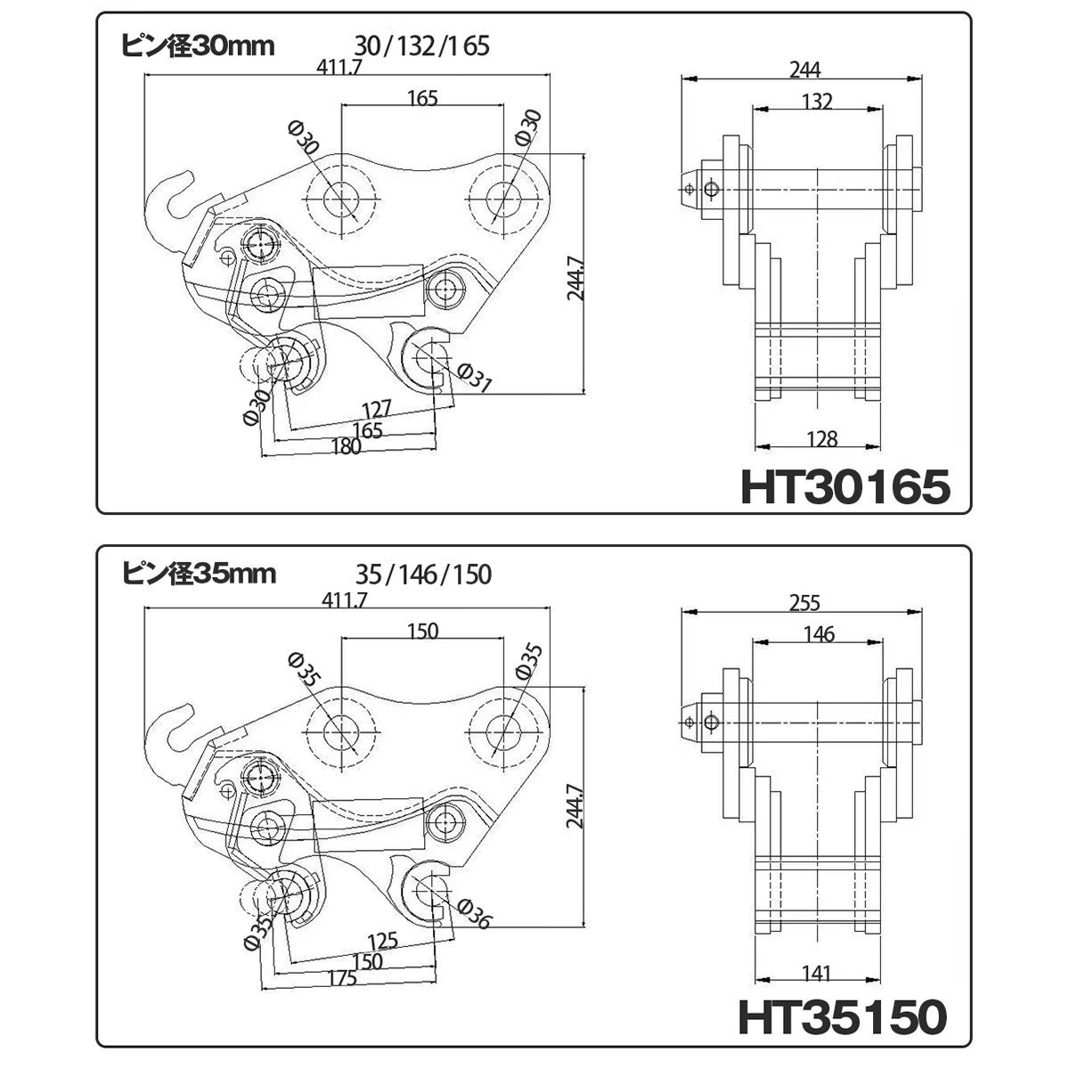 ヒッチピン径:30mm アーム幅:132mm ピン取付幅:165mm 取付許容範囲:127-180mm サイズ:412×244×245mm 重量:28kg 適合ユンボ:1-2t |