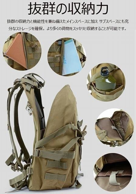 【優れた汎用性】 普段使いはもちろん、登山やキャンプ、防災時など様々なシーンで使える、耐久性 防水性に優れたバックパックです。 【抜群の収納力】 通常のリュックサックの容量が20L~30Lなのに比べ、約50Lもの大容量を備えたバックパック。重量やサイズ感も大き過ぎない実用性の高いアイテムです。 【豊富なストレージ】 抜群の収納力と機能性を兼ね備えたメインスペースに加え サブスペースにも充分なストレージを確保。 より多くの荷物をスッキリと収納することが可能です。 【高い機能性】 4箇所以上のストレージに加えて、ボトム部分にはカメラスタンドなどの 棒状の荷物や横幅のある荷物を運ぶためのバックルがついており、 より効率よくたくさんの荷物を運ぶことが可能です。 【耐久性&防水性】 抜群の収納力と機能性を兼ね備えたメインスペースに加え サブスペースにも充分なストレージを確保。 より多くの荷物をスッキリと収納することが可能です。 ※画像撮影時の状況や、PC上の環境により多少色合いが異なって見える場合があります。