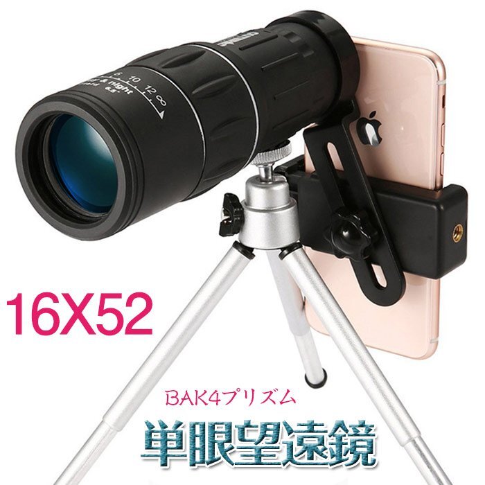単眼鏡 望遠鏡 高倍率 ズーム 16倍 16X52 BAK4プリズム 高透過率 スマホホルダー 三脚 軽量 スマホレンズ スマートフォン対応 ☆1点