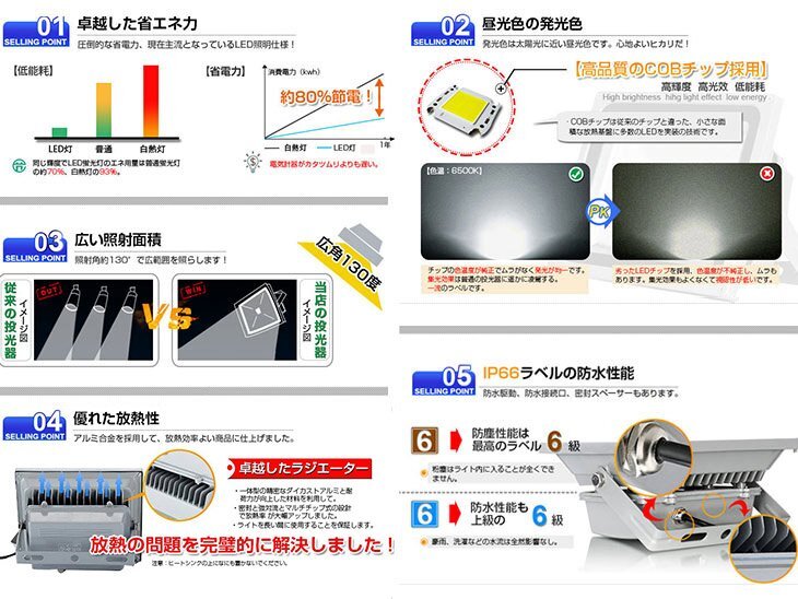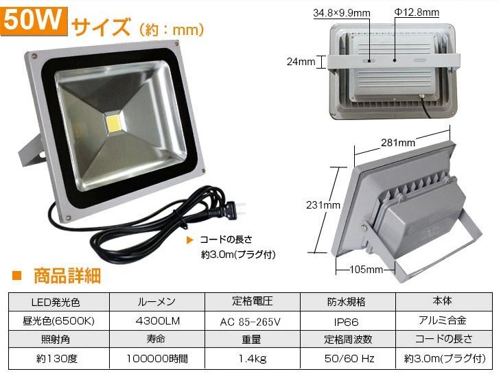 ◆LED採用の省エネ投光器ライト: 50Wと省電力で、従来の500W相当の明るさです!IP66規格の防水仕様!屋内·屋外両方ご利用OK!また倉庫用の照明·集魚灯·看板灯など用途は様々! ◆カバーは強化ガラス: 普通のガラスの4~5倍の強度を持つ強化ガラスを採用、光線の透過率は大幅アップします。透過率は98%以上に達する! ◆放熱性のいいアルミ合金: アルマイト処理のアルミ採用することで、放熱性を更なる段階に引き上げ!耐熱範囲内の正常な働きを保ちます。 ◆角度調整可能: ライトは柔軟な角度調整機能を持ってます。使い方も非常にカンタン! ◆驚きの長寿命: 本製品は100000時間以上の長寿命で、他の商品の2000時間を遥かに凌駕します。 ◆ファッションの設計: アルミ合金のボディ、グレーの外観は高級感が持ってます。 ◆広い使用範囲: トンネル、掲示板、ガソリンスタンド、夜間作業、現場工事、駐車場、公園、運動場にも様々な場所で活躍します!公園、運動、屋外や現場作業にも便利です!特に、夕暮れ時夜間作業にとても役立ちます! 虫が集まりにくいの も魅力です。 【保証】 ◆当商品は12っヶ月保証となります。 ◆お届けから1週間以内にご連絡のあった不良品の保証対応の送料は当方が負担いたします。 ◆保証期間内の不良品ですが、交換のみ対応しております。往復送料はお客様負担となります。在庫がない時だけ返金しますので、ご了承ください。 |