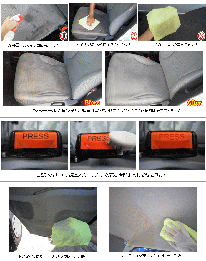 | 業務用 強力マルチクリーナー「CDC」はカーショップや量販店では入手出来ないプロ専用品ですので一般販売されている物とは洗浄力が違います!時間が経過してしまった頑固な汚れにも効果的!これ一本で泥等の一般汚れ 手垢 タバコのヤニ ・コーヒーやジュースをこぼしたシミ チョコレート等の食べこぼし・尿や血液・嘔吐してしまった際にも優れた効果を発揮します!「CDC」は無駄に泡立ちませんので扱いが楽です。色々な洗剤を試しても満足のいかなかった方へおすすめの商品です! | ||||||||