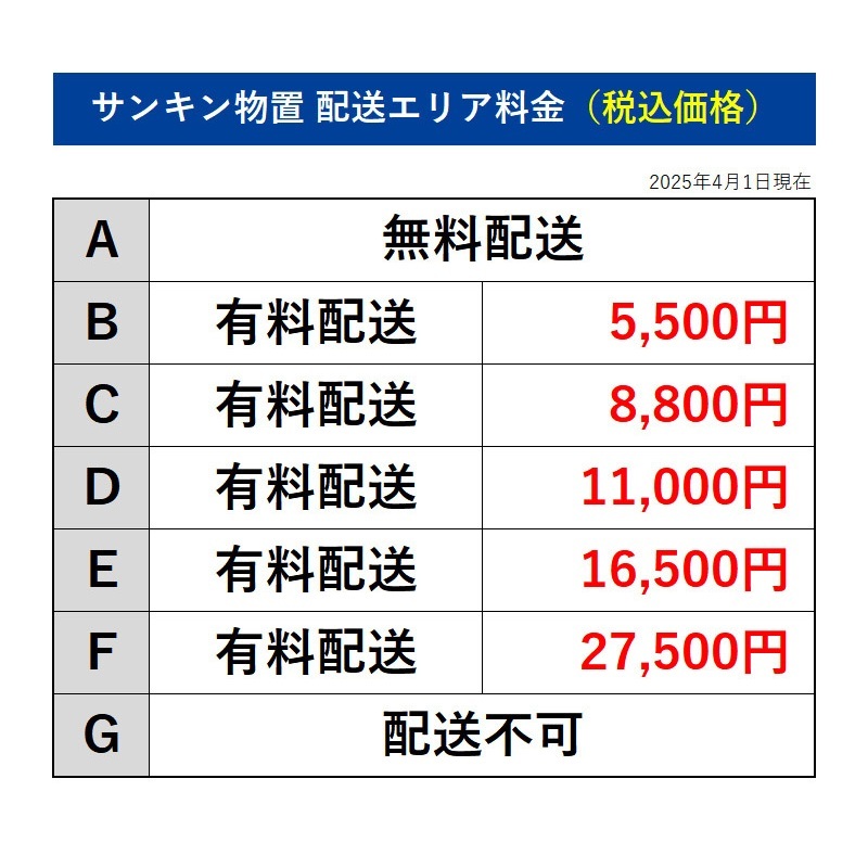| 発送詳細 | ・お届け先都道府県によって一部地域は送料が自動加算されます。 末尾の配送マップにてご確認下さい。 ※北海道、沖縄、離島、宮崎県、鹿児島県は配送不可です。 ・商品の高さや幅が3mを超える長尺のカーポートやテラス、物置、ガレージ等の大型 商品の場合は、配送用の4tトラック(ワイド、箱車含む)が現場まで通行できるか を必ず確認して下さい。 ・道路が狭いなどの理由で、配送車両が現地に到着できない場合、お客様にお引き取り をお願いする場合があります。 お客様によるお引き取りが不可の場合、チャーター便追加料金が発生いたしますの で、道路幅などは確実にご確認ください。 ・一階渡しとなります。 2階以上の階上げは行っておりません。 ・年末・年始・お盆・ゴールデンウィークや年度末等の繁忙期前後の渋滞や工事混雑、 配送混雑、台風・地震・雪等の天災により遅れる場合が御座います。 それによる設置工事の遅れ等については、当店では責任を負いかねますので予め ご了承下さい。 ・配送会社のやむを得ない事情により納期が遅れる場合がございます。 その場合、当店では責任を負いかねますので予めご了承下さい。 ・配達日指定できます。 (施工日に合わせた配達が可能です。) ※但し、メーカー指定の便にて無料配送致しますので時間指定、 ならびに日・祝祭日の指定日配達はご利用頂けません。 ※交通機関の不具合や悪天候などその他の不可抗力が生じた場合には、 商品の到着時間帯および到着日が前後することがありますのでご了承下さい。 ・お盆や正月などはメーカー休業日により発送ができません。 ・発送元について、お届け先に近い工場から出荷する場合も御座います。 |