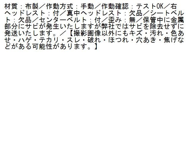 | 商品情報 | 材質:布製/作動方式:手動/作動確認:テストOK/右ヘッドレスト:付/真中ヘッドレスト:欠品/シートベルト:欠品/センターベルト:付/歪み:無/保管中に金属部分にサビが発生いたしますが弊社ではサビを除去せずに発送いたします。/【撮影画像以外にもキズ・汚れ・色あせ・ハゲ・テカリ・スレ・破れ・ほつれ・穴あき・焦げなどがある可能性があります。】 | ||