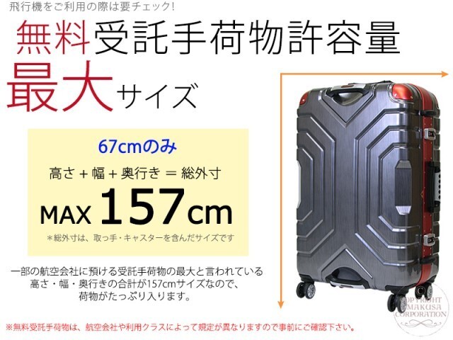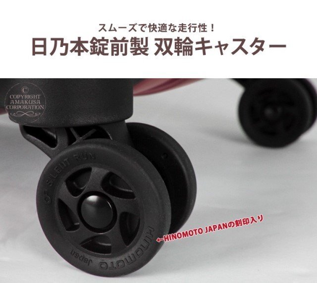 美しくカッコイイ未来的なデザイン!(株)シフレのスーツケース≪ESCAPE'S/B5225T≫ ポリカーボネート+ABS樹脂を使用した頑強ボディに、ダブルTSAロックや双輪キャスターを装備。 持ち上げた時に「えっ」と驚いてしまうほど、とっても軽い仕上がり♪ デザインのアクセントにもなっているバーハンドルで荷物の上げ下げも楽に行えます。 高級感溢れるカラー&デザイン、機能性を兼ね備えたついつい人に自慢したくなるスーツケースです。 ![]() コーナーパッドも装着し、ぶつけたり擦れたりしやすい角部分を守ります。またこのコーナーパッド及びカラーフレームは錆に強い『アルマイト加工』が施されています。 ![]() 【2】床からの持ち上げはもちろん空港のターンテーブルから荷物を受け取る際にも二つのハンドルが大活躍! 【3】車のトランクに出し入れする際も、ぶつけにくく、スムーズに行うことができます! ■TSAロック&リバーシブルキー ![]() ![]() ■双輪キャスター 360度回転する双輪キャスターを採用。8個のキャスターが抜群の安定力と走行性を発揮してくれます。 ■段階調節可キャリーバー 段階調節が可能なキャリーバーを採用! 2輪走行で引く際はバーの長さを短くすることで、混雑した所でも人にぶつけにくく、歩きやすい♪