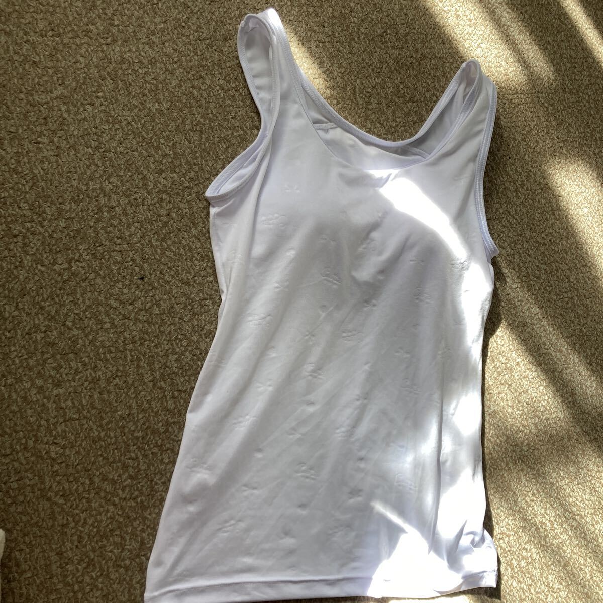 試着のみの タンクトップです。自宅保管していた物を 着用してみたところ、サイズが合わない為出品します。先日まで、タグも付いていました。夏用の白色。うっすら模様があります。