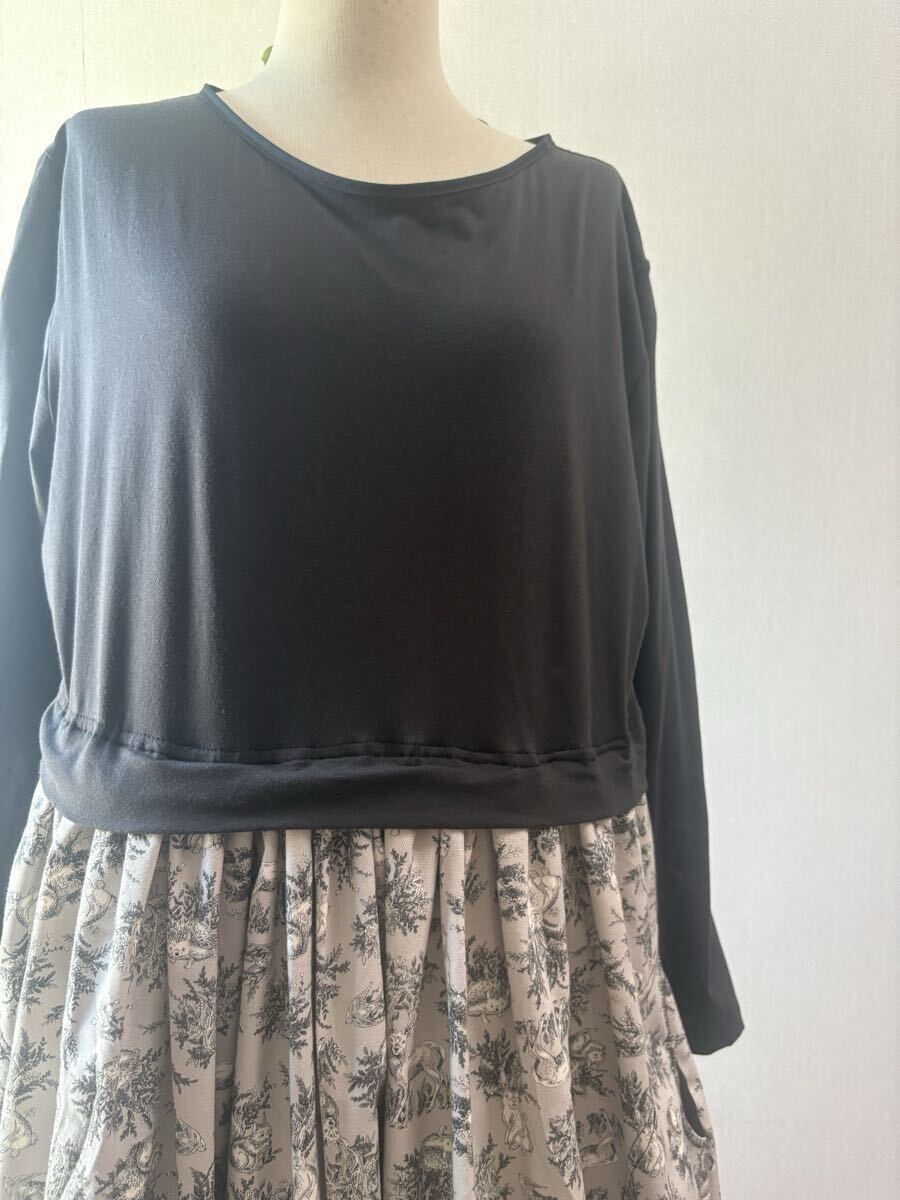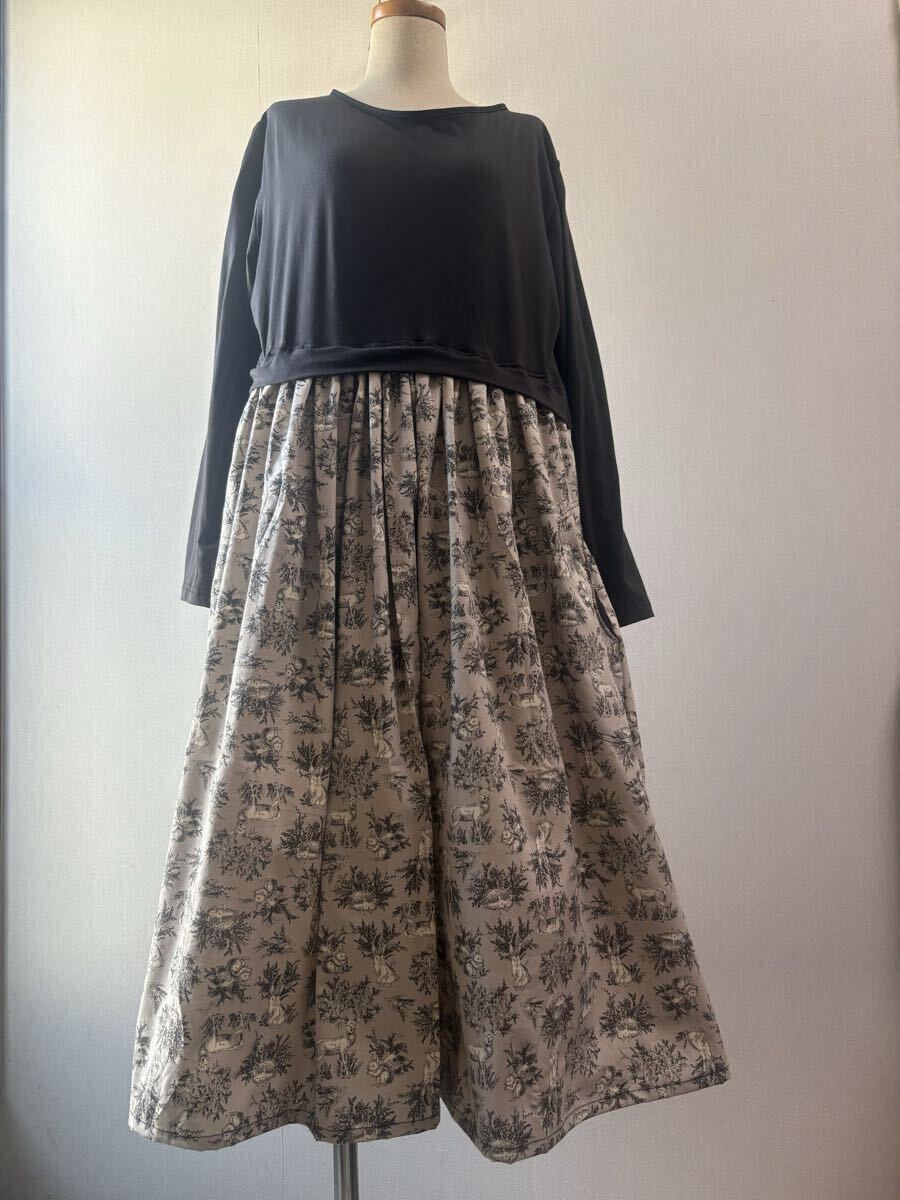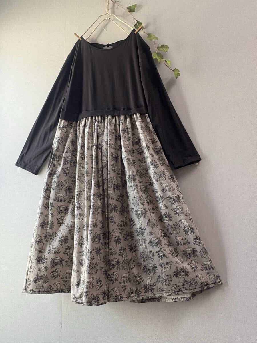 スカートが小動物柄のワンピースです。 背中のリボンもポイント! 両サイドにポケット付 柄:コットン/リネン素材 無地部分:伸びるニット生地 ポリエステル/コットン 一点一点手作りした品です。 サイズ:フリーサイズ <平置き寸法> 身丈108cm・脇下身幅50cm 肩幅40cm・袖丈56cm ※丈詰め・ポケット付けなどのお直しは承っておりません。 | |||