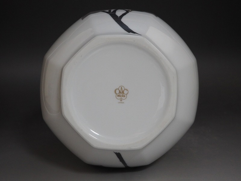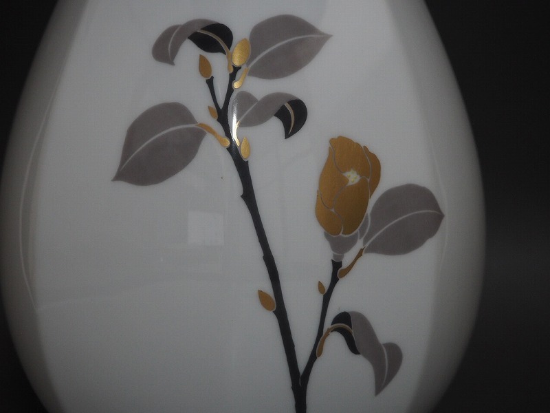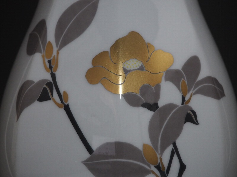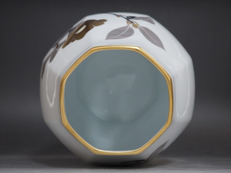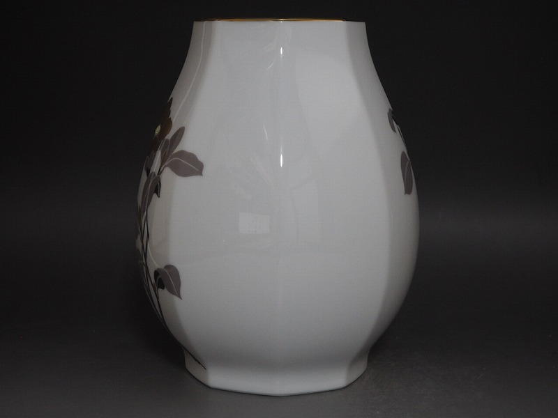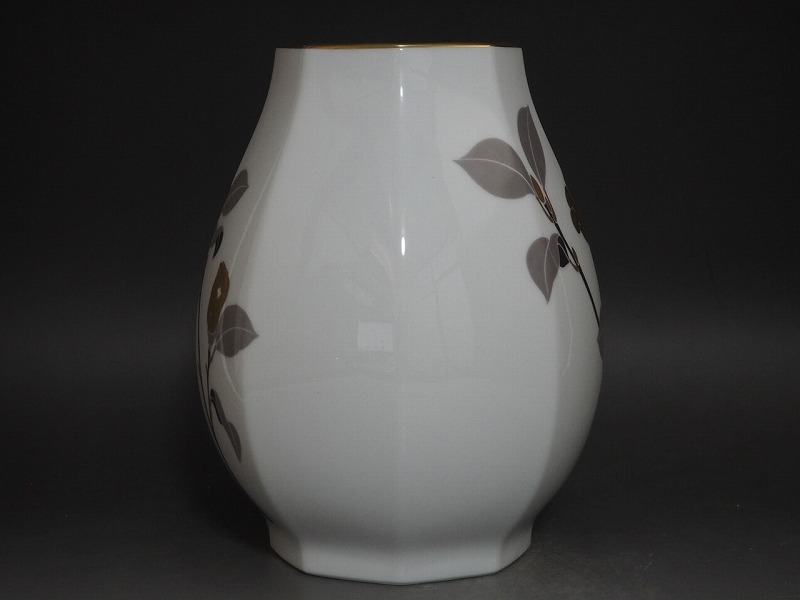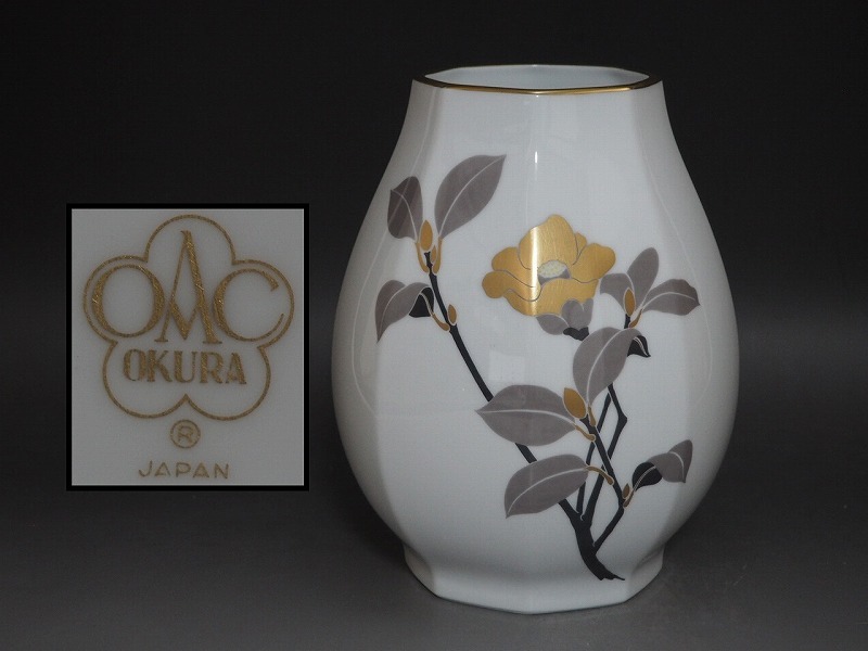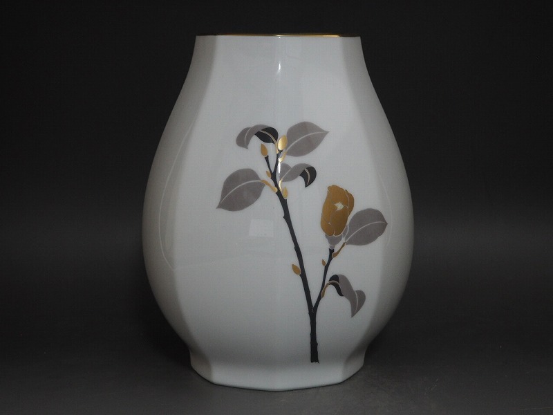 | C0682 大倉陶園 金蝕 椿図 面取花瓶 高24㎝ ☆ 美品 良品 無傷 華道具 花道具 花器 金銀彩 花瓶 花入 花生 飾壺 飾壷 フラワーベース OKURA | ||