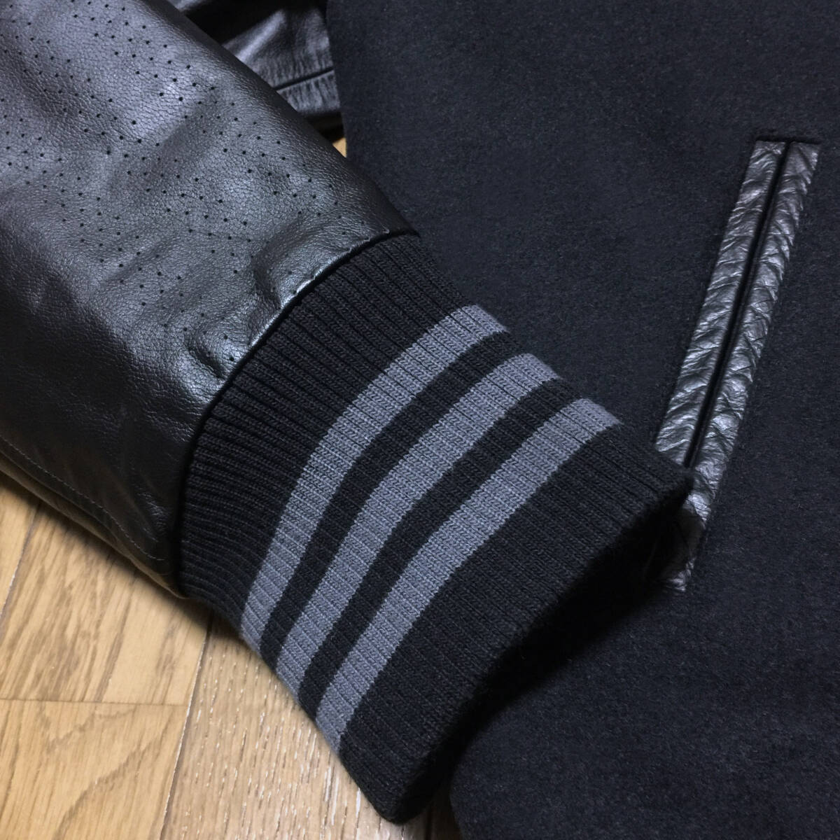 | 【ブランド】 adidas アディダス 【デザイン・モデル】 2004年製 VARSITY JKT パンチングスリーストライプス バーシティジャケット 牛革 レザー × メルトンウール 中綿 袖革 スタジャン 【生産】 アディダスジャパン株式会社 【詳細・コメント】 adidas アディダス 袖革 スタジャンになります。柔らかく上質メルトンウールのボディに、袖には柔らかい牛革レザーを使用。ブラック×ブラックをベースに、胸元にはロゴ刺繍、袖にはパンチングライン・リブ部分にはグレーカラーのスリーストライプをアクセントで使ったアディダスならではのディテールを盛り込んだスタイリッシュなデザイン。フロントはスナップボタン、裏地はキルティングの中綿入りです。 正規品です。 【サイズ】 表記: O (メンズXL程度) ※実寸を参考にして下さい。 平置実寸:身幅60㎝ 着丈73cm 肩幅50㎝ 袖丈66㎝ ※多少の誤差はご了承ください。 【カラー・パターン】 黒黒 ブラック × ブラック ※ご覧になられるモニターや、デジカメの撮影具合によって色味が異なる場合がございますのであらかじめご了承ください。 【品質】 身頃部分:ウール80% ナイロン20% 袖:本革(牛革 レザー) リブ:アクリル70% ウール30% 裏地:ポリエステル 100% 中綿:ポリエステル100% 【コンディション】 USED 中古品 です。リブの毛羽立ちやレザー部のシワ・傷など多少の使用感ございますが、目立ったダメージは無く状態も良好です。まだまだ着用いただけます。※写真参考に判断して下さい。ユーズドアイテムにご理解ある方のみご入札お願い致します 。 | |||