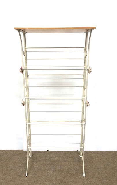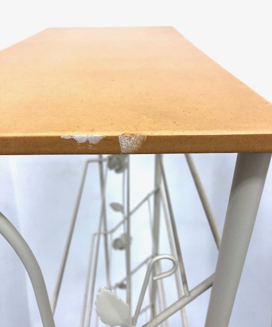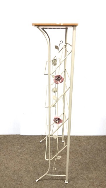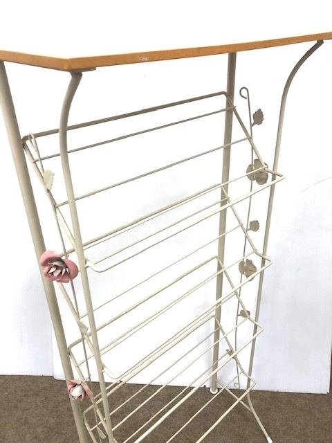 商品説明 サイドにバラの飾りがあしらわれている、オシャレなラックです。 棚が斜めになっていますので、狭いスペースでもスリッパやシューズがコンパクトに収納できます。 詳細 ●サイズ:高さ105cm幅48cm奥行き23cm ●素 材:金属・木製 ●ランク:Dランク ●コンディション:天板に3箇所ペンキの様な汚れと傷がありますが、使用に問題はありません。 |