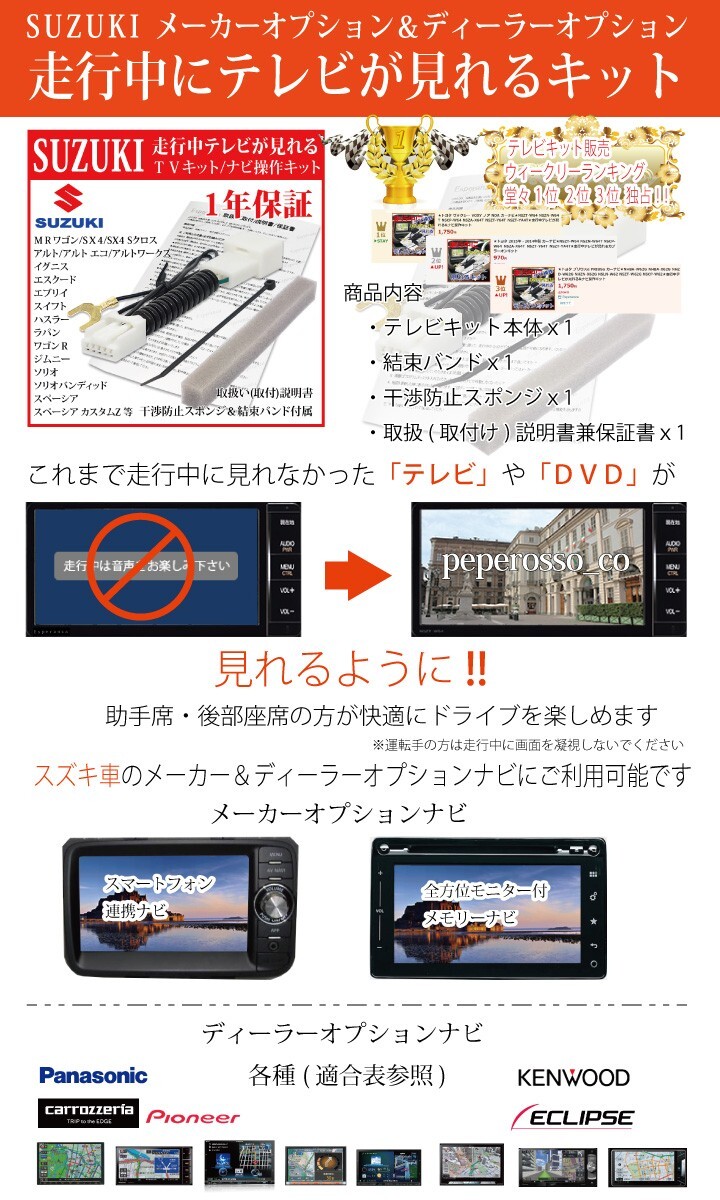 | ★スズキ テレビキャンセラー テレビキット ナビ操作 ジャック ジャンパー 走行中 運転中 TVが見れるキット スペーシア スペーシアカスタム スペーシア ギア ソリオ ソリオハイブリッド ソリオ バンディット ハスラー ハスラータフワイルド エブリィ アルト ラパン ラパンLC スイフト ワゴンR ワゴンR カスタムZ ワゴンRスティングレー ワゴンRスマイル 25年 99090-69U25-P01 CN-FZ10A7ZA 99098-69U25-P02 CN-FZ8A6ZA 99098-69U35-P03 CN-HZ8A5ZA 99097-80T35-P04 CN-HZ7A5WZA 99098-69U45-K01 SKX-S809 99097-80T45-K02 KXM-E509W 99097-80T55-K03 KXM-P509W 24年 99090-53U24-P11 CN-FZ1097 99098-53U23-P12 CN-FZ896 99097-69T24-P13 CN-FZ796WZA 99098-53U34-P14 CN-HZ895 99097-69T34-P15 CN-HZ795WZA 99098-53U44-K11 SKX-S808 99097-69T44-K12 KXM-E508WS 99097-69T54-K13 KXM-E508W2S 23年 99090-53U23-P01 CN-FZ1087ZA 99098-53U23-P02 CN-FZ886ZA 99097-69T23-P03 CN-FZ786WZA 99098-53U33-P04 CN-HZ885ZA 99097-69T33-P05 CN-HZ785WZA 99098-53U43-K01 SKX-S807 99097-69T43-K02 KXM-E507WS 99097-69T53-K03 KXM-E507W2S ※他適合有り(適合表要確認) ★高品質・高精度の最新型テレビキット(全て新品・未使用) ★スズキ純正メーカー付け及びディーラーオプションナビゲーションに対応 メーカオプションナビ:テレビキット(下図 左スマートフォン連携ナビはナビ操作可/右ハーマン社製ナビはナビ操作不可) ディーラーオプションナビ:テレビキット&ナビ操作可(適合表に記載の機種) ※タイトルの機種対応品:その他の機種の場合はこちらの出品リストページの検索窓 [この出品者の商品から探す] に 【 TZ11 ナビ機種名】を入れてご検索ください (ご不安な場合はお問い合わせください) ★下記適合表にてTZ12が適合の車種は 【 TZ12テレビキット 】 をご利用ください ★メーカーオプション9インチメモリーナビの場合は 【 TZ32 テレビキット&ナビ操作キット】 をご利用ください ★ナビ操作不可の機種(ハーマン社製メモリーナビ)用走行中にナビ操作も可能にするキット 【 TZ21 テレビキット&ナビ操作キット】 もございます その他同じ用途の下記ナビゲーション専用品も出品いたしておりますこちらからご検索ください *記載のない物に関しての適合は当方では分かりかねます |