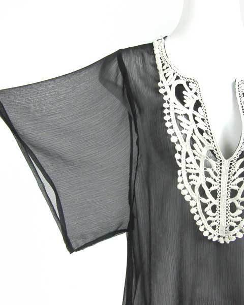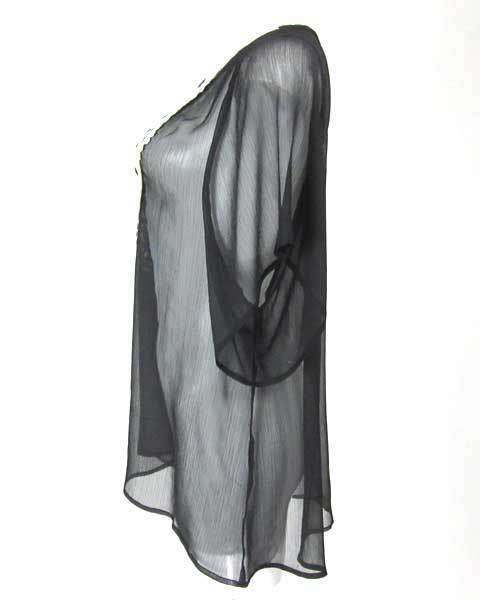 | 大人可愛いカジュアルがキマるプルトップブラウス☆しわ加工が施されたシフォン生地がさらりとエアリーな1枚です。大きく開いたキーネックを飾るレースがシックな黒に映える、華やかで可愛いデザイン。ゆったりと女性らしいシルエットです。インナーとのコーディネートをお楽しみください。 |
