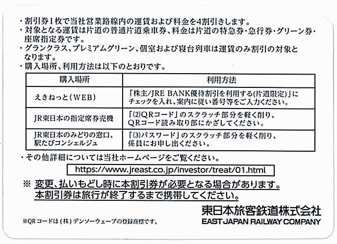 有効期限は「2026年6月30日」です。 割引券1枚で営業路線内の運賃および料金が4割引になります。 対象となる運賃は片道の普通片道乗車券、料金は片道の特急券・急行券・グリーン券・ 座席指定券です。 ※詳細につきましては、画像やホームページの株主優待割引券をご覧ください。 |