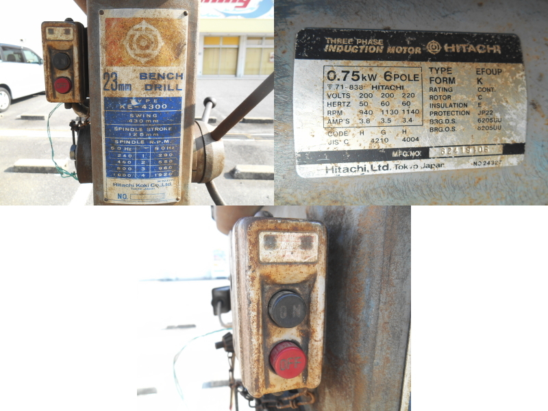 | 仕様 ●メーカー 日立工機 ●型式 KE-4300 ●外形寸法 W360×D640×H1360mm ●電源 三相200V 50/60Hz ■日立工機製、23mmボール盤を激安価格にて提供いたしますので、この機会に是非よろしくお願いいたします。 ■画像記載通り当方にて動作確認済みとなっております。電源のON、OFF、ドリルチャックの開閉、ドリルチャックの回転動作、ハンドルによる主軸の昇降、作業テーブルの回転およびハンドルによる昇降も問題ありません。 ※ベルトは新品に付け替えておりますので、よろしくお願いいたします。 ■消耗品、消耗部品に関してはノークレーム、ノーリターンでよろしくお願いいたします。 ■当方専門業者ではありませんので、細かな動作まではわかりかねますので、細かな点でのクレーム等はお受けいたしかねますので、御了承下さい。 ■当方本商品に対して専門知識がありませんので、専門知識を要する質問、動作にはお答えいたしかねますので、ご了承の上宜しくお願いいたします。 ■動作確認、簡単な清掃も行っていますのでご検討宜しくお願い致します。 ■新品ではありませんので使用感や多少のキズ等あります。ご理解のうえ入札ください。コンディションに強いこだわりのある方はトラブルの原因となりますので、入札はお控え下さい。 ■TOP画像にあるものが全てです。※大きな商品や重い商品は、台車等に乗っていることや動作確認時に、当方所有の備品を使用して確認しますが、そちらは商品には含みませんのでご理解の程、お願い致します。 ■その他ご質問はお気軽にどうぞ。 | ||