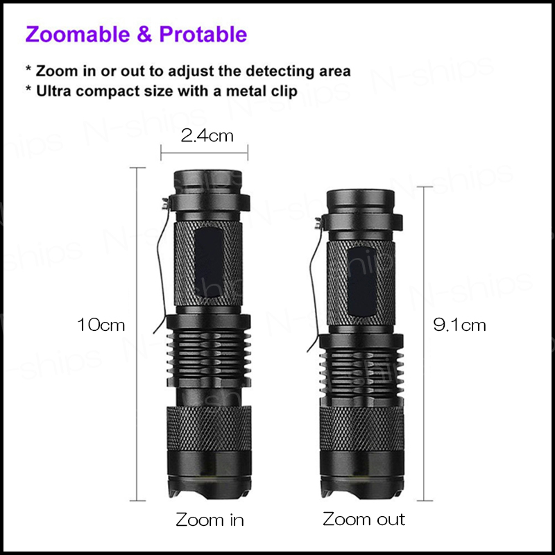 | LED小型UVブラックライトです。 いろいろな用途に利用でき、 コンパクトで持ち運びも簡単。 紫外線照射可能なLEDハンディライト。 ピーク波長は365nmで、 紫外線の蛍光反応が最も良い波長を使用しています。 ズームイン、アウトで照射エリアの変更ができ、 点灯モードは強、弱、点滅の3段階切り替え。 ■使用用途■ ①汚れや傷の発見 人の歯や爪、血液や尿までこのUVライトで光るので、 流し台やカーテン、じゅうたん、洋服、 シーツ、トイレや洗面所など、 家の中で照射してみると目に見えない汚れが 簡単に浮かび上がります。 トイレの壁などを照らしてみると 気づかない汚れもよく見える! 乾燥して見えなくなった ペットや犬、猫、ネズミなどの排泄物も見つけることが可能です。 ②夜釣りのルアーの蓄光 グロー系のルアーやワームの仕掛けに対して 照射するとあっという間に蓄光可能です。 ③鉱物や宝石、骨とう品などの品質の検査 ④郵便物のバーコード確認 ⑤お札の偽造防止の印刷確認 ⑥ジェルネイルやネイル、UVレジンのレジン硬化 ⑦衣服への像白剤や蛍光剤の残留確認 ⑧クレジットカードの偽造防止の確認 ■商品詳細■ サイズ:92mm×26mm 防水:IPX5 使用電池:単三電池×1(電池は付属しません) | |||