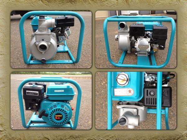 | 仕様 | エンジン 1シリンダー、4ストローク空冷式エンジン 5.5HP/400rpm 燃料 無鉛ガソリン 作動能力30㎥/1時間 燃料タンク容量3.6L / 作動燃費0.8時間/1L 全揚程/吸入揚程 全揚程26m / 吸入揚程6m |
