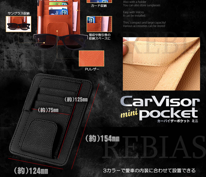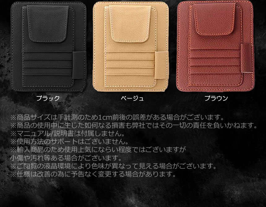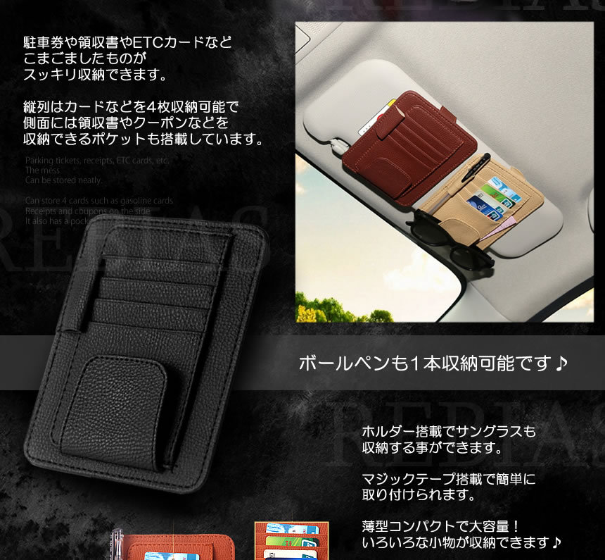 こちらのカラーは 【オレンジブラウン】 になります。 駐車券や領収書やETCカードなどこまごましたものがスッキリ収納できます。縦列はカードなどを4枚収納可能で側面には領収書やクーポンなどを収納できるポケットも搭載しています。ホルダー搭載でサングラスも収納する事ができます。マジックテープ搭載で簡単に取り付けられます。薄型コンパクトで大容量!いろいろな小物が収納できます♪商品サイズ:(約)154x124mm| 出价者 | 信用 | 价格 | 时间 |