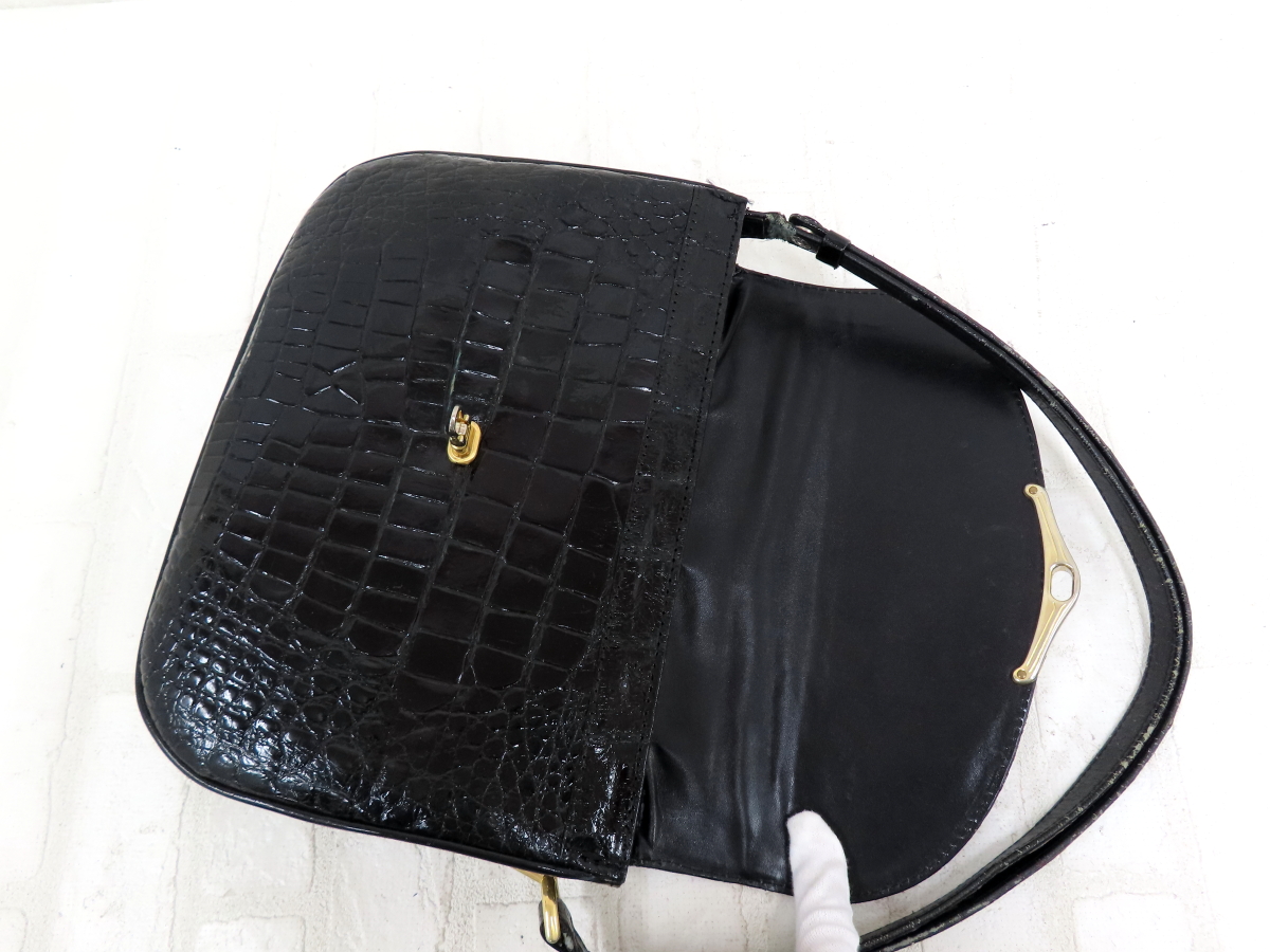 ◆美品◆GENUINE◆シャイニング クロコダイル 本 ワニ 革◆ショルダー バッグ◆ブラック ゴールド金具◆ヴィンテージ◆フラップ◆A15453