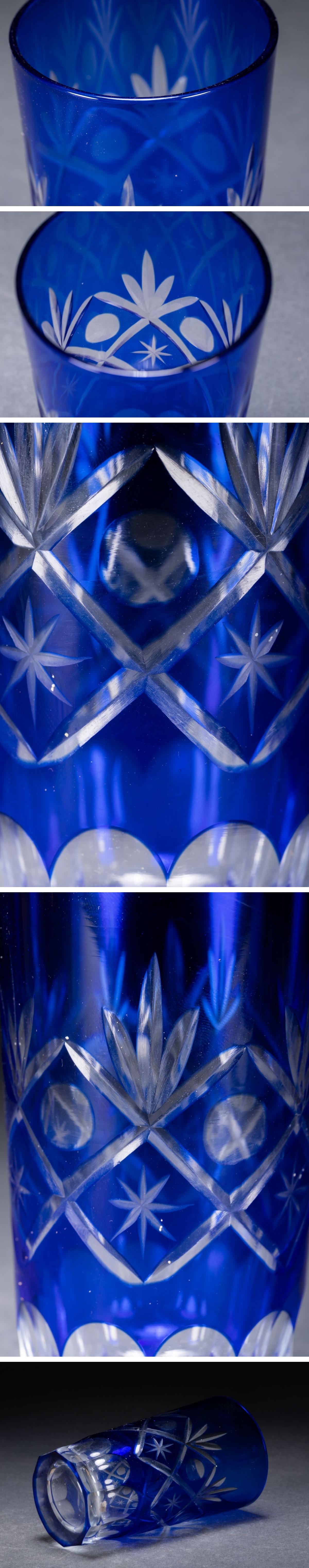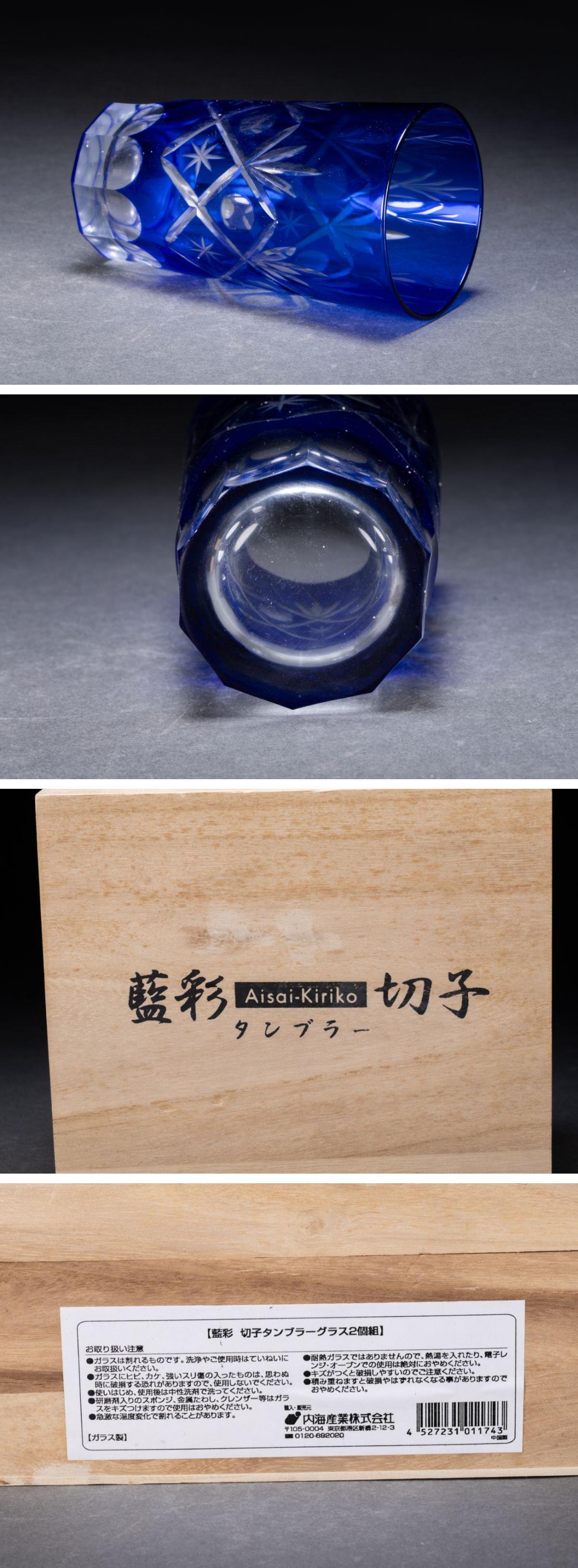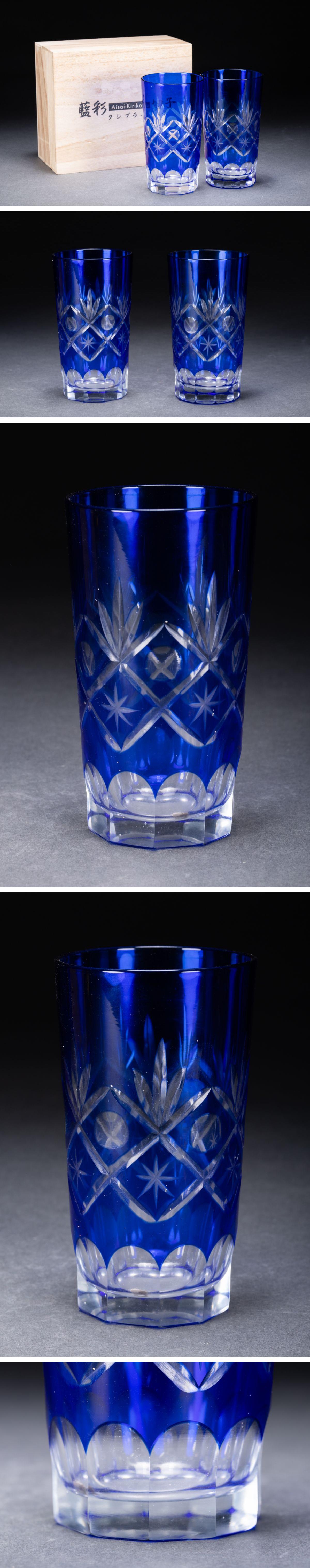 【清】関西某オークション購入 藍彩切子 タンブラー冷酒杯 二客 共箱 7L8-43S