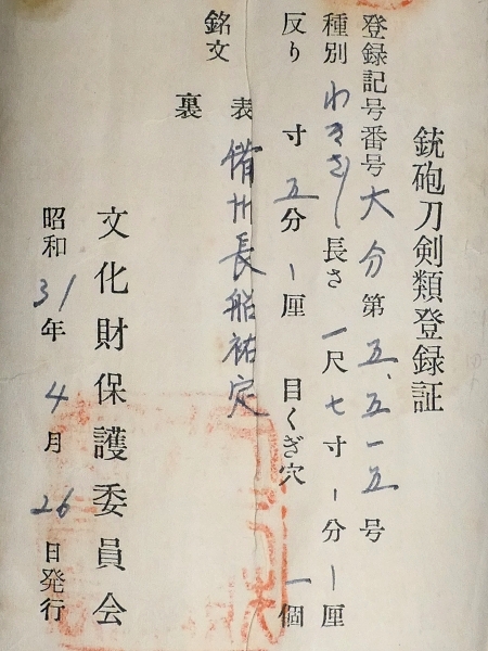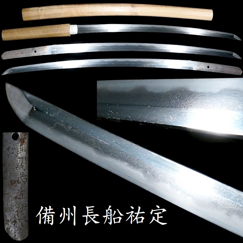 | 寸法 | (長さ) 1尺7寸 (反り) 5分 (目釘穴) 1個 (元幅) 約 2.71cm (元重) 約 0.61cm (先幅) 約 1.85cm (先重) 約 0.43cm (中身の重さ) 約 483.5g (種別) 脇差 (銘文) 備州長船祐定 |