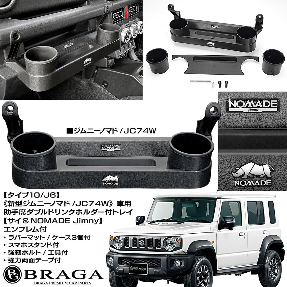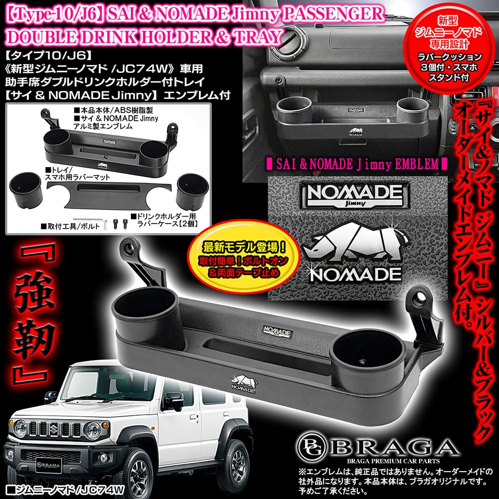 《タイプ10/J6》【サイ & NOMADE Jimny エンブレム付/ 新型ジムニーノマド車用JC74W】助手席用ダブル ドリンクホルダー付多目的トレイ/滑り止めラバーケースマット付/ABS樹脂製/スマホ スタンド/吊下げフック付/多機能で優れた収納レイ/客注品 欧米仕様/ブラガ BG BRAGA
