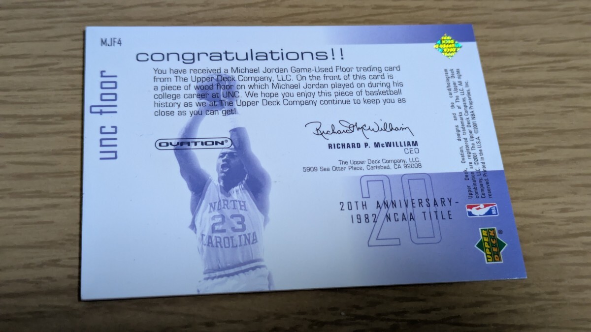 マイケル・ジョーダンが大学時代に練習に励んだノースカロライナ大のバスケットコートのフロア板の一部がインサートされたカードです。カードは種類あってその1枚です。{MJF4}。