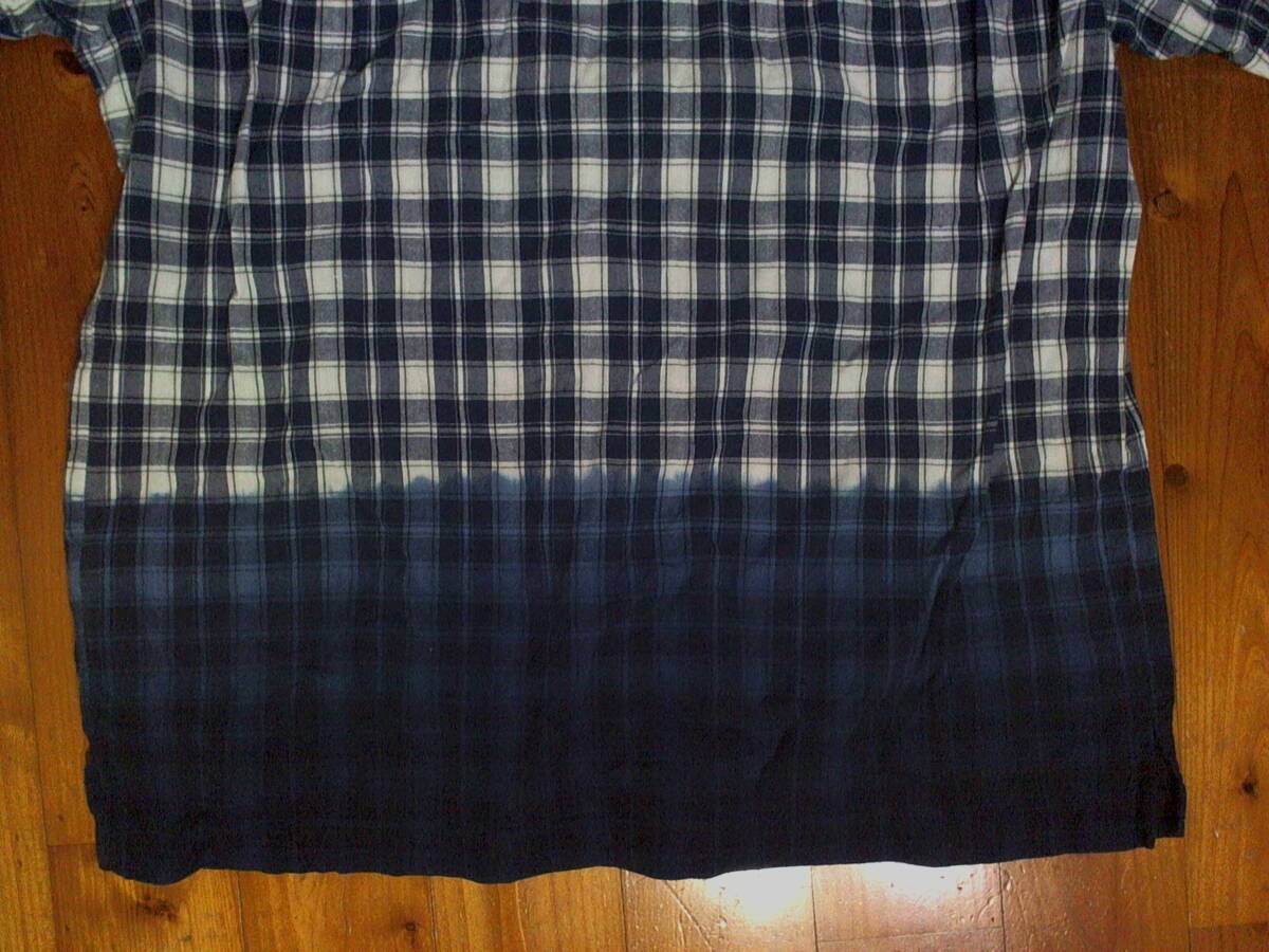 綿素材の平織り系で、白ベースに紺系のチェック柄と裾先一帯に後染めの紺色。。