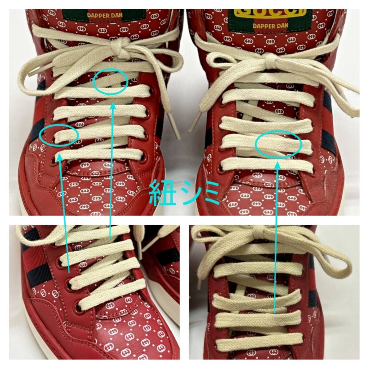 くつ紐が赤いハトメと接触して少し赤いシミが付いてます。