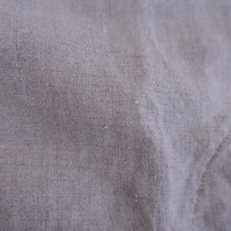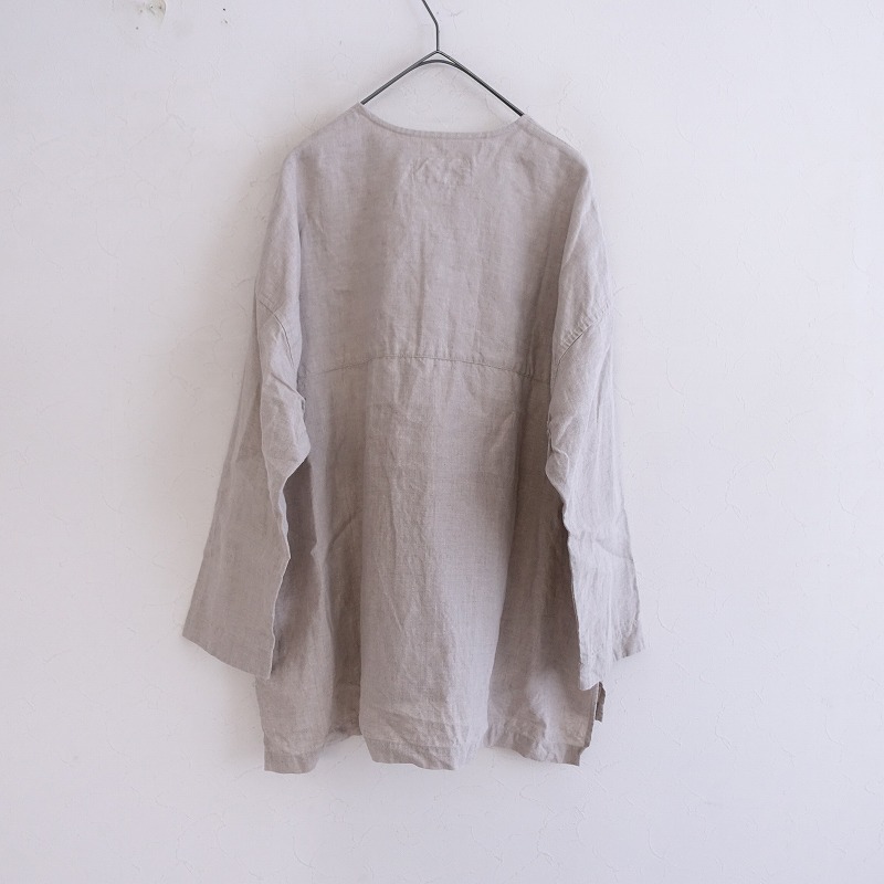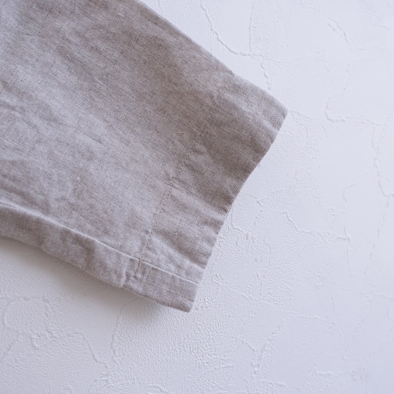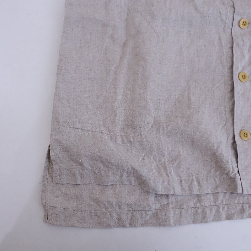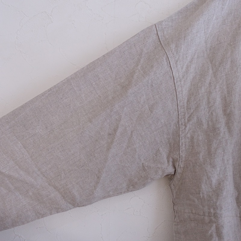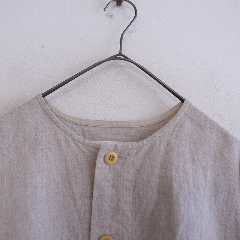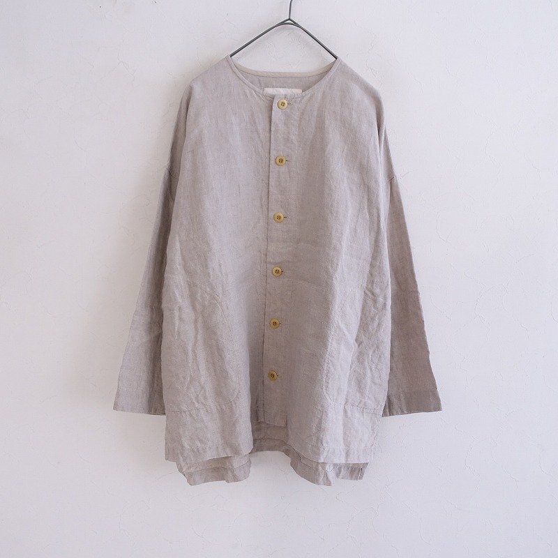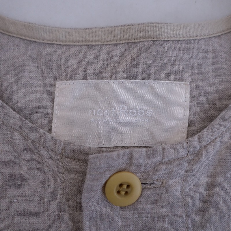 | nest Robeのリネンジャケットです。カラーはサンドベージュでリネン特有の張りのある薄手生地で仕立てられております。ノーカラーデザインで、ゆったりとしたシルエットになっており、着丈はフロント側が少し短くなっております。フロントボタン開閉で着脱でき、両サイドにシームポケットが付いております。 |
