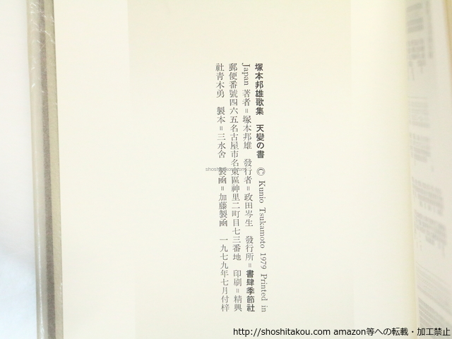 歌集 天変の書 毛筆識語署名落款入 / 塚本邦雄 ◯当店在庫から「塚本邦雄」の本を探す| ★ 発送方法 (送料無料) ・日本郵便のゆうパケット・レターパックライト・レターパックプラス・ゆうパックの中から荷姿の大きさに適した方法で発送します。(発送方法や到着日時はご指定いただけません。) ・上記発送方法はすべて追跡番号付き・土日配送有・速達扱いです。ゆうメールや定形外は発送に使用いたしません。 ・ゆうパケット・レターパックライトは郵便受けにお届け、レターパックプラス・ゆうパックは配達員対面受取です。防水梱包します。 ★ 必ずお読みください ・代金決済後の次の火木土に発送します。 ・ストア出品です。ご注文時に必要事項のご記入・決済いただいた後は、やり取り不要です。商品の到着をお待ち下さい。 ・肉筆物・美術作品は真作保証いたします。 ・商品のレファレンス(調べ物)サービスは行っておりません。また当店商品以外の無料鑑定は行っておりません。 |