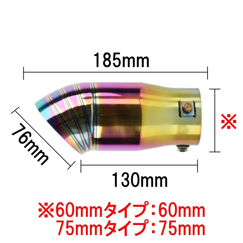 | 商品内容 汎用マフラーカッター 特徴 ・装着可能マフラー外径(60mmタイプ):38mm~58mm ・装着可能マフラー外径(75mmタイプ):53mm~73mm ※お客様のお車に合ったサイズをお選びください ・カラー:チタンブルー/シルバー/ダークグレー/マジョーラ ・数量:1個(※両サイドマフラーの場合は2点お買い求めください) ・形状:ストレート ・テール:斜めカット ・材質:ステレンス 適合確認 ※タイトルにある車種は参考車種になります。 ※タイトルにある車種でも排気量やグレードによって マフラーの外径やリアバンパーの形状が異なります。 必ずマフラーの外径とリアバンパー形状 及び商品の寸法をご確認ください。 取付に関する注意事項 ・専門業者様による取付を推奨しております。 ・火傷防止のためマフラーが冷えた状態で作業してください。 ・脱落防止のため定期的に増し締めしてください。 ・取付、使用に関わるケガ、事故等につきまして 弊社は一切の責任を負いかねます。 |
