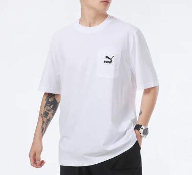 - ブランド: PUMA - 色: ホワイト - サイズ: L - 特徴: ポケット付き - 状態: 新品 ブランドアイコンの刺繍をあしらった胸ポケットが、こなれたアクセントを効かせているCLASSICS半袖Tシャツです。ワントーンでまとめた定番のアイテムは着回し力が高く、様々なスタイリングと好相性