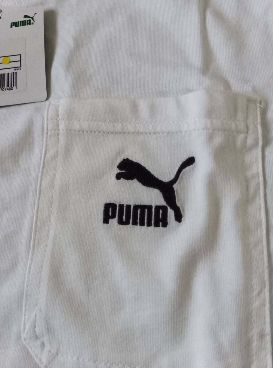 ホワイトのPUMA Tシャツ、Lサイズ、ポケット付きでスタイリッシュ。