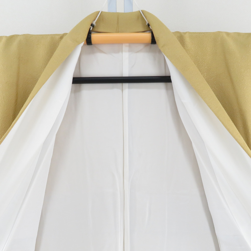 | 色無地 丹後ちりめん 袷 辛子色 余り布付き 一つ紋 違い鷹の羽紋 正絹 広衿 仕立て上がり着物 身丈164cm |