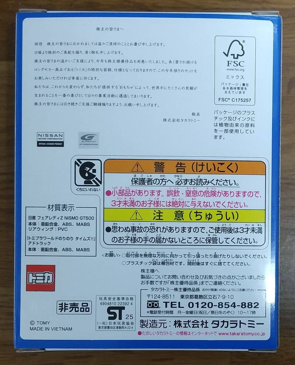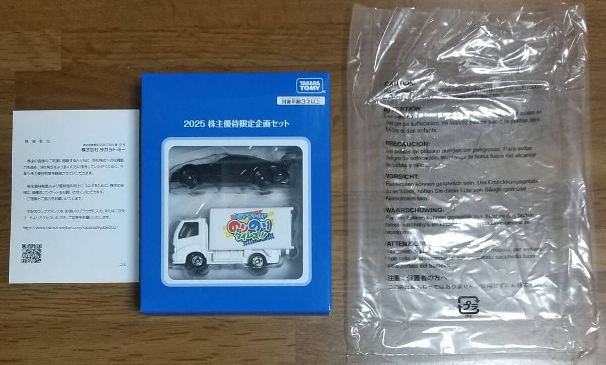 | 商品説明 | ●ミニカーで、2025年株主優待の未使用品です。 オリジナル「トミカ」2台セット ・トミカ55周年ロゴを施した日産フェアレディZ NISMO GT500 ・『トミプラワールドのりのりタイムズ!!』アドトラック ●付属品なし(写真に写っている物が全てです。) ●商品説明参考サイト https://www.takaratomy.co.jp/ir/stock/stockholder.html |