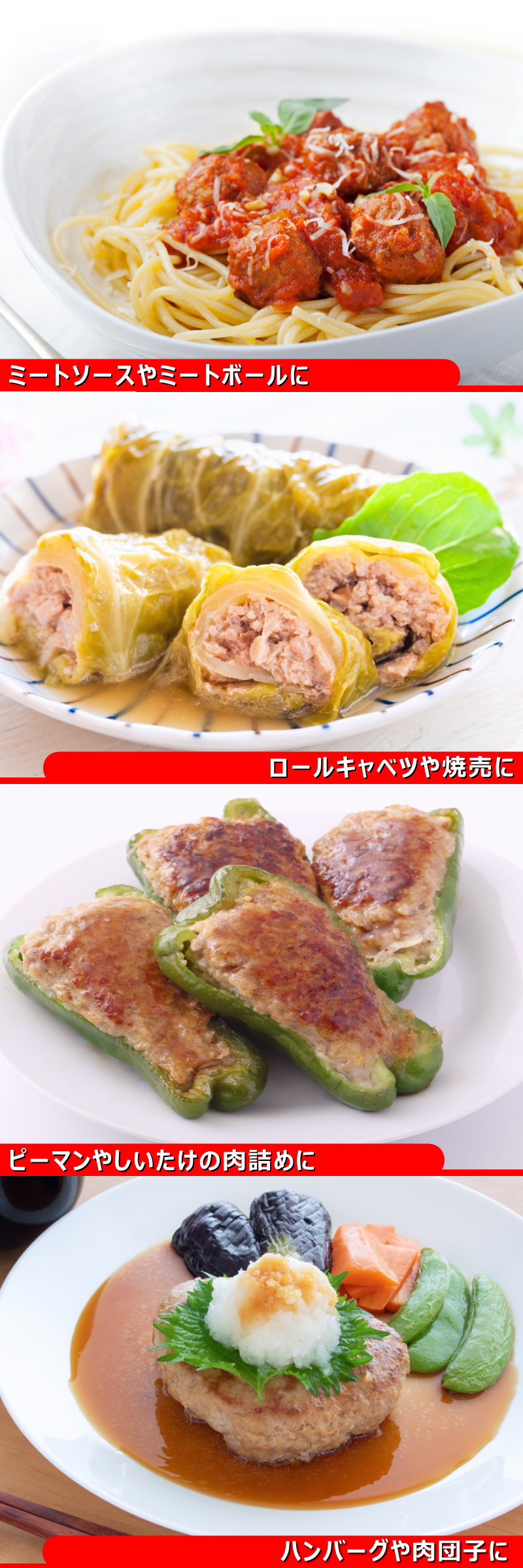 ハンバーグ、餃子、麻婆豆腐、そぼろ煮、キーマカレー等