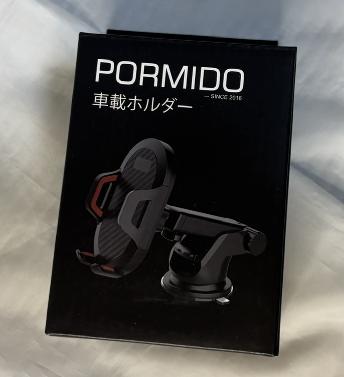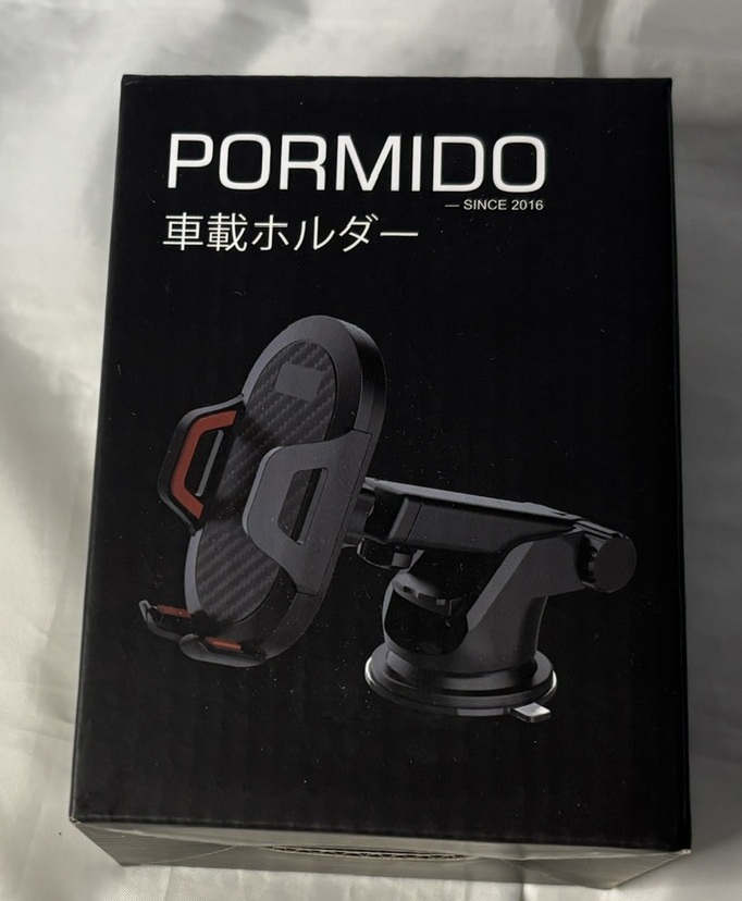 PORMIDのスマートフォン 車載ホルダーです。 吸盤タイプです。(ダッシュボードに吸盤用シートを張り付けるタイプです。) エアコン通風孔に差し込めるアダプターも付属します。 梱包の関係で元箱から取り出し、元箱は折りたたんだ状態での送付になります。 |